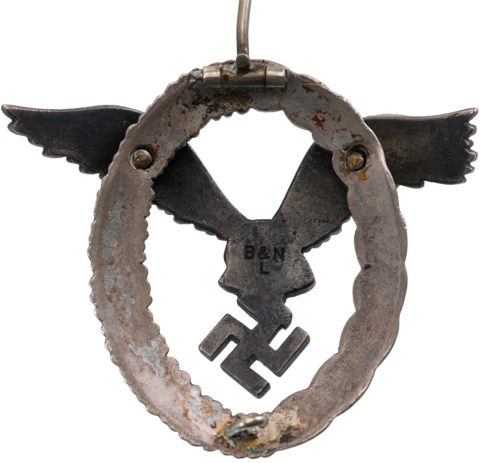 SKU: 1234 Auction has finished. Total bids: 0GERMANY - 3RD REICHSilver Badge. Breast Badge, 64x53 mm., silvered Tombac, maker's mark "B&N L", vertical pin on reverse. An early, interesting model! I Shop ID: BO 26Auction LX - Day 2