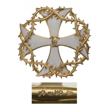 Officer`s Cross in gilt Silver, 47 mm, one side enameled Malta Cross, between the arms a crown of thorns, in the centre the cipher of King Carol II, on reverse hallmarked "37-crown-90", maker`s mark "HW (Heinrich Weiss, Bucarest)", with original reverse pin. Founded by King Carol II, on the 26th of November 1937, awarded only "Propriu Motu" by the King for