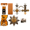 Grand Cross Set of the 2nd Type, 81x59 mm, gilt Silver, white enameled badge, centre medallion with the frosted-finishes, gilt phoenix rising from the flames, reverse medallion with royal monogram of King George II from 1936), upper loop and royal crown suspension and circular ring; original full length sash with bow. Breast Star, 82 mm, with smooth, convex and concave rays, gilt phoenix, the top ray with a gilt, royal crown; the reverse with rivets, broad pin (hallmark "925") and two side hooks; in the original, orange case of issue with the Phoenix embossed in gold on the lid, maker`s mark of Zimmermann, Pforzheim and of P. Zenetos Freres, Athens, printed on the inner cushion. An very rare group of finest manufacture; very fine condition. I RR!