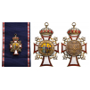 Grand Cross Badge. Sash Badge, 80x45 mm, in gilt Silver with red bordered, white enameled arms, royal monograms "G", center medallion in very fine enamel-work, within a gilt circlet with lions and hearts, the reverse with the Greek coat-of-arms, upper crown with loop and ribbon ring, original, full length sash ribbon. A beautiful badge, of high rarity.