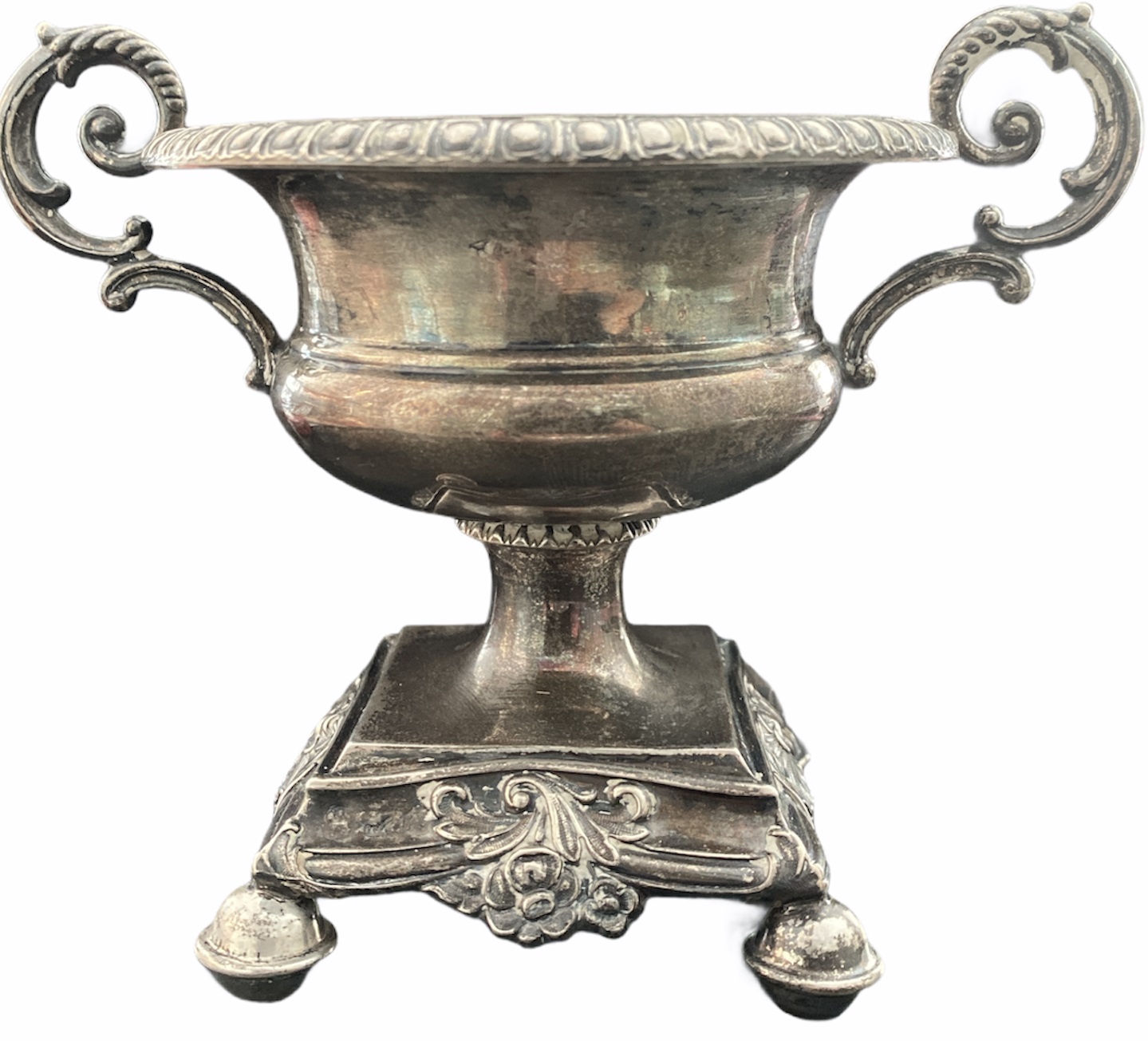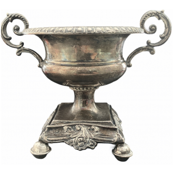 Silver condiment cup on an antique model, square piedouche base with four balls, crater vase with openwork winding handles, decorative shell, beaded border. Weight 152 g. Height 10 cm, handle to handle diameter 14 cm. End of the 19th century Good condition