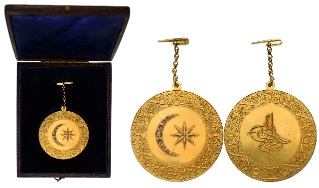 Breast Badge, 42,0 mm., with 10 diamonds for a total of 0.168 ct., GOLD, the obverse with the Sultan’s tughra within flowers and bows, “1801” at the base, the reverse with Crescent, this, set with 9 diamonds of different sizes and Star within flowers and bows; with original chain-and-hook suspension, in the original rectangular, fitted, dark brown morocco case of issue, with blue velvet and purple silk interior compartment.