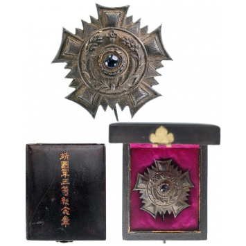 Breast Star, 61x61 mm., embossed Silver, 5-armed cross, flanked by stylized beams, the centre with deep blue colour cabochon within outer circlet embossed wheat, the reverse with long, Chinese inscription on gilt surface, vertical pin, in the original, dark red morocco case of issue with silk lined, fitted inner compartment.