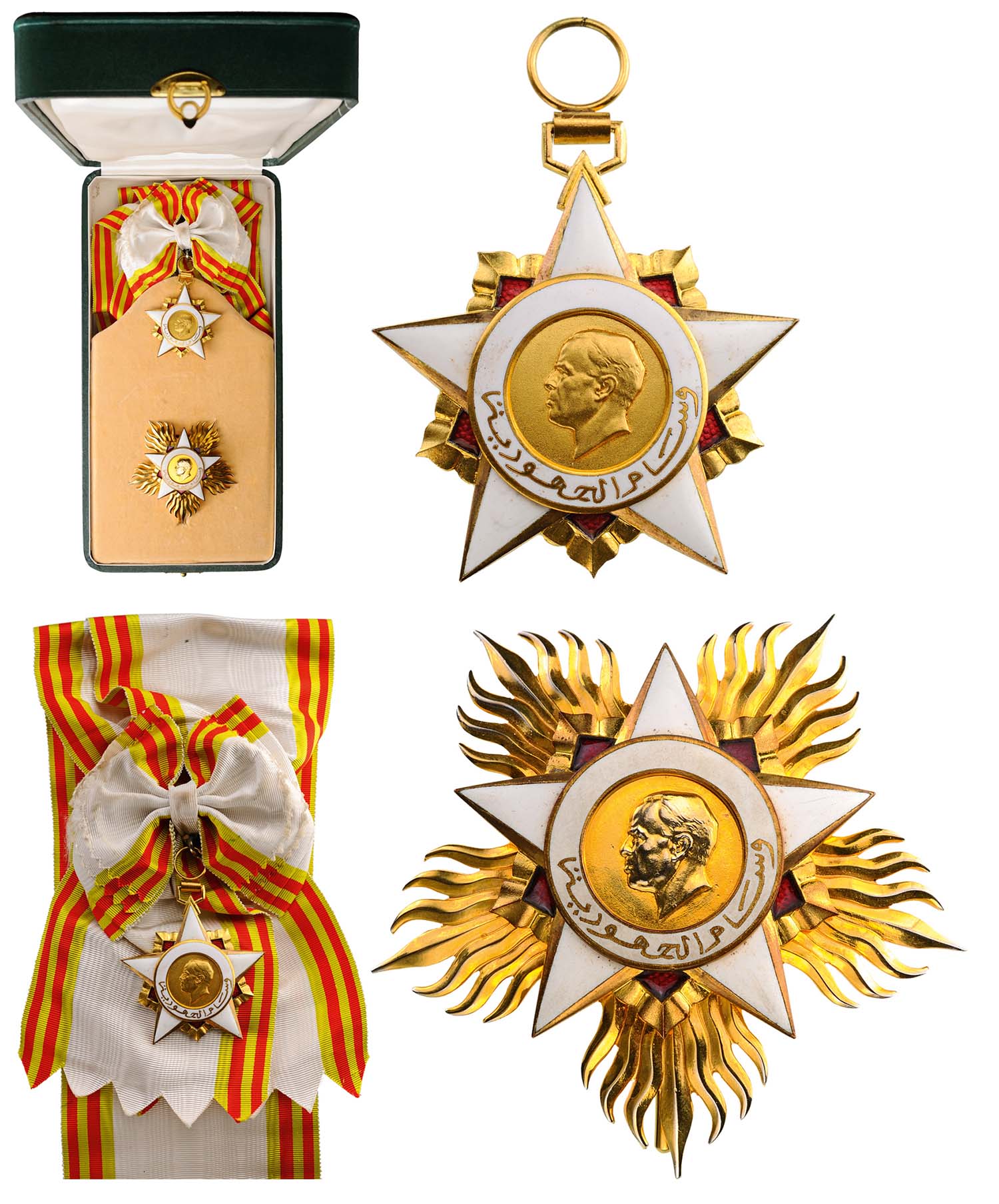 Grand Cross Set, 1st Type . Sash Badge 63x56 mm in gilt Bronze in the form of a white enameled star, flanked by stylized rays with red enameled detail, gilt centre medallion with the profile of President Bourgiba within white enameled outer circlet with gilt, Arabic inscription, smooth reverse, with convex counter-medallion, with original, silk sash ribbon. Breast Star, 75x79 mm in gilt Bronze with bright-polished waved rays, superimposed by the enameled order`s insignia, the reverse, fitted with broad, vertical pin, in the original, green morocco case of issue.