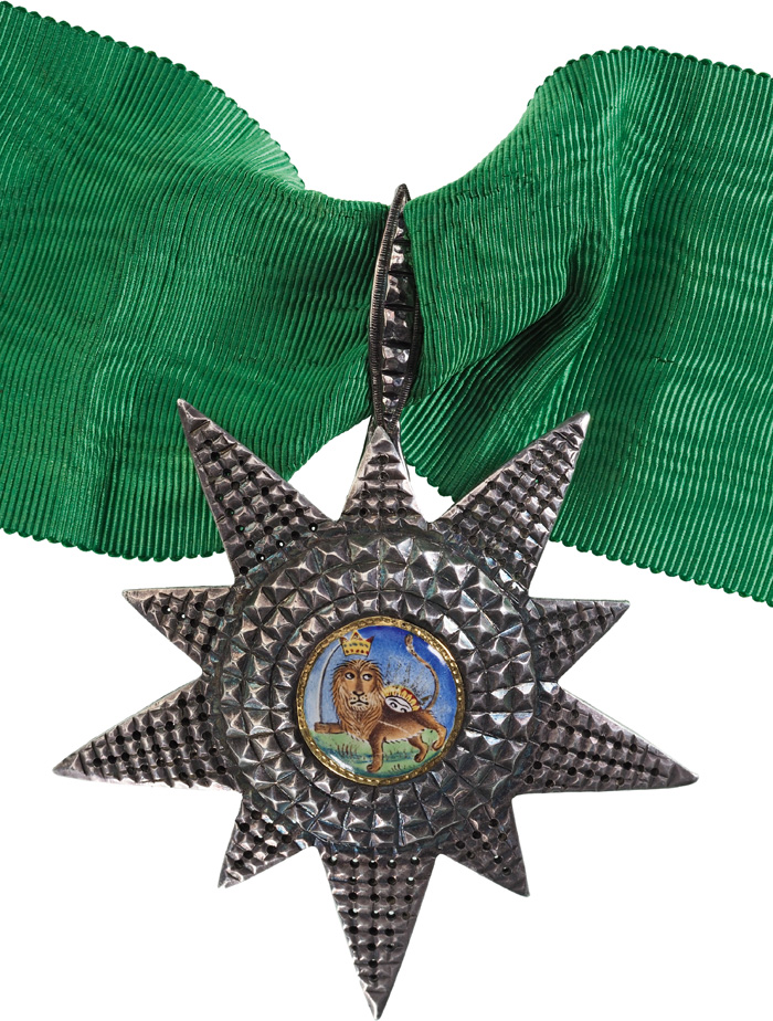 An early 1st Class Badge to be worn at the neck, 71 x 67 mm., chiseled Silver star, composed of five major rays flanked by shorter ones, centre medallion in gold with excellent enamel miniature of the Lion passant guardant, holding a scimitar, on sky-blue background with beaming, rising sun; around, triple, chiseled, round border, indicating the class, the upper ray with loop, linked to the ribbon ring, with diamond-cut chiseled details; with original, silk, neck ribbon.