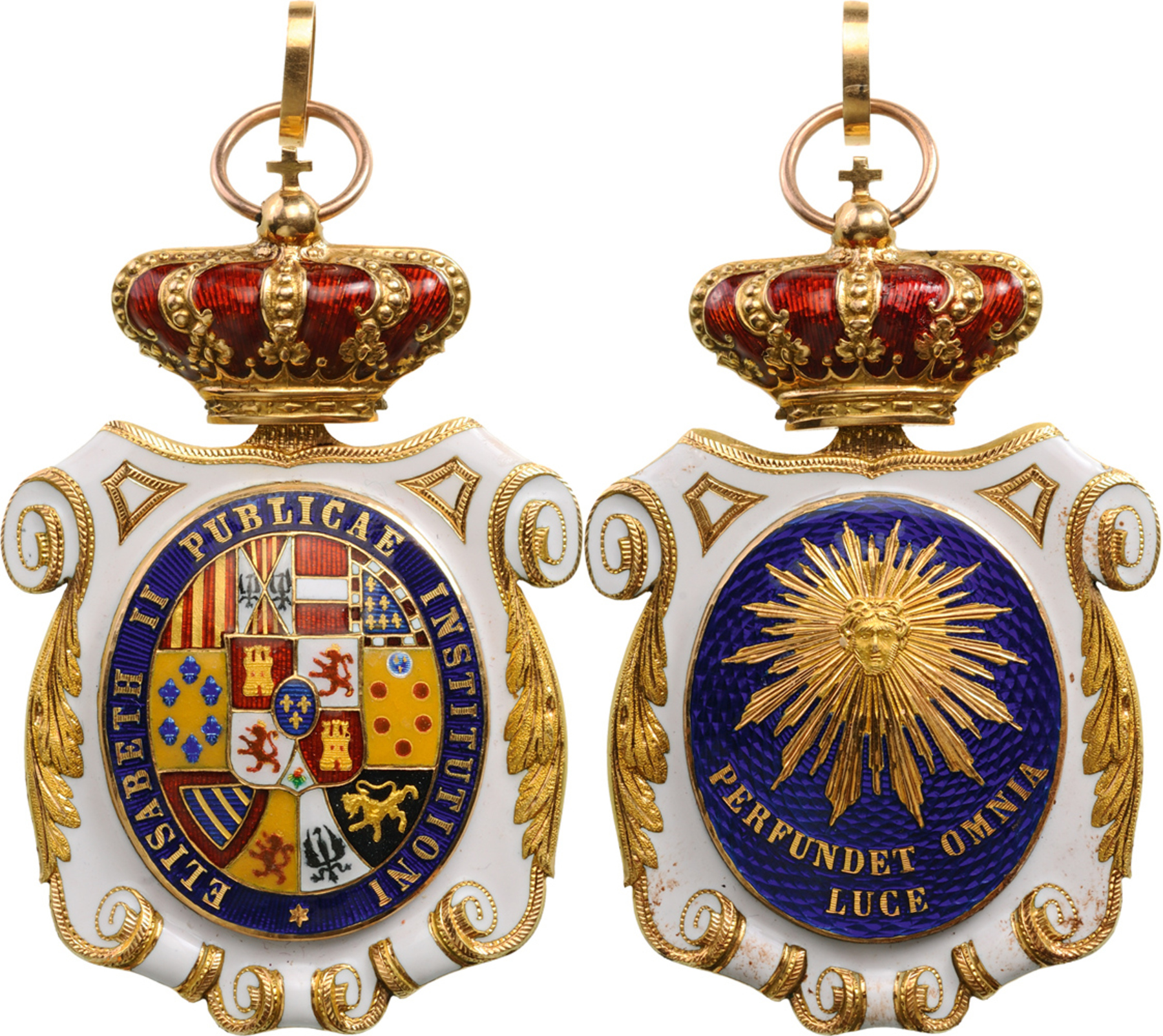 Merit Badge in GOLD and white enamel, 67x43 mm, with chiseled details, oval centre medallion with polychrome arms of Spain, blue enameled outer circlet with inscription "ELISABETH II PUBLICAE INSTITUTIONI", blue enameled reverse medallion with golden beaming sun and the inscription"PERFUNDET OMNIA LUCE", hinged upper crown with red enameled details, round suspension ring and further oval ring. A very rare insignia, excellent condition and quality! I RR!