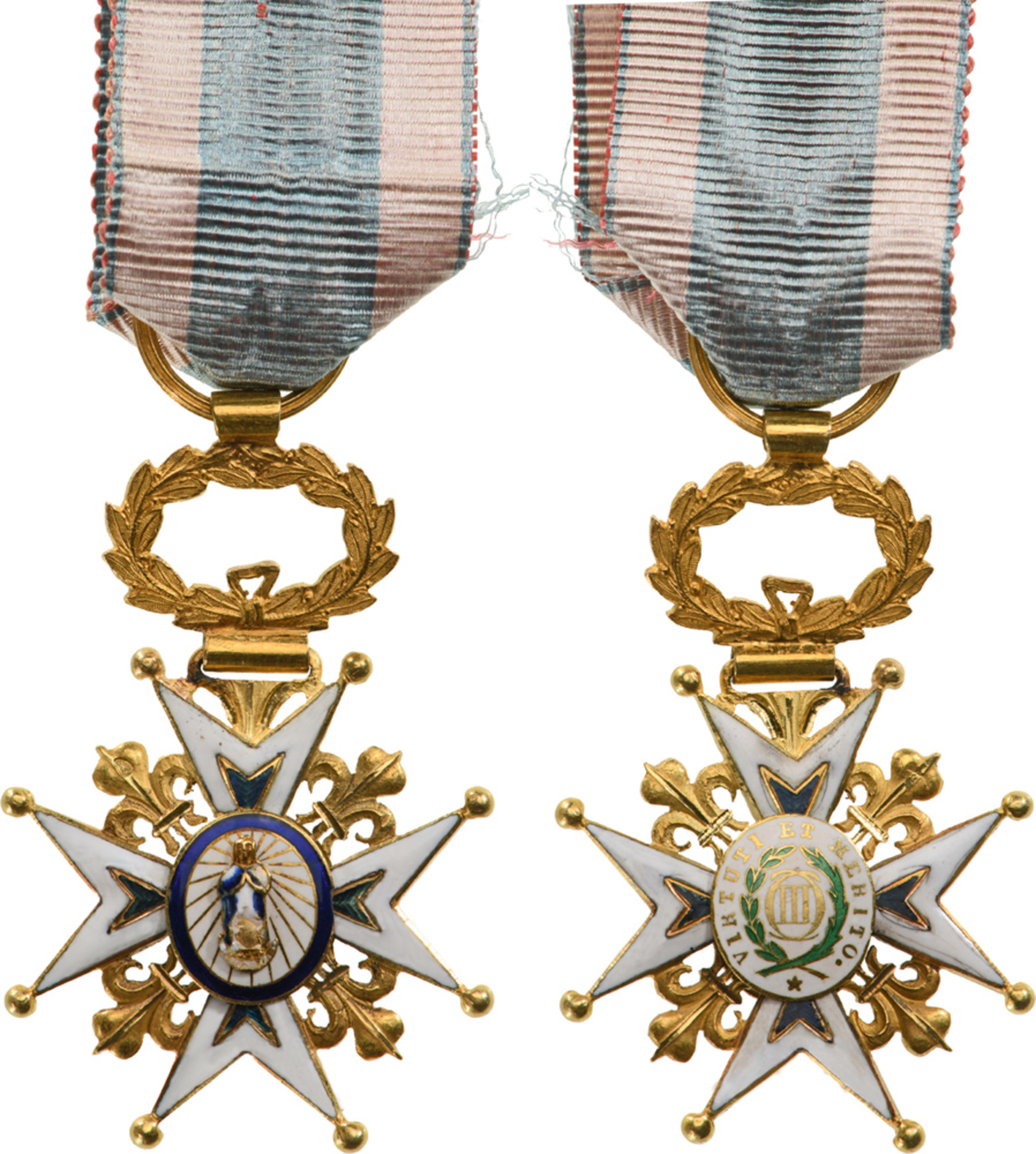 Officer`s Cross, 1819-1838, 1st Type, 4th Class, instituted in 1771. Breast Badge of reduced size, 39x25 mm, GOLD, 7.1 g., both sides enameled (minor restorations), both central medallions GOLD, enameled, original suspension ring and ribbon. An extremely rare model of the creation, of superb quality! II RR!