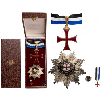 Grand Officer's Set, 2nd Class, instituted in 1960. Neck Badge, 70x57 mm, gilt Bronze, obverse enameled, with ornamented suspension loop and original long ribbon. Breast Star, 77 mm, gilt Bronze with smooth rays, superimposed part gilt, hallmarked, enameled, reverse with thin pin, with miniature and lapel hole rosette, in case of issue by "Frederico Costa, Lisboa", with gilt Portuguese Republic coat of arms on the lid. I