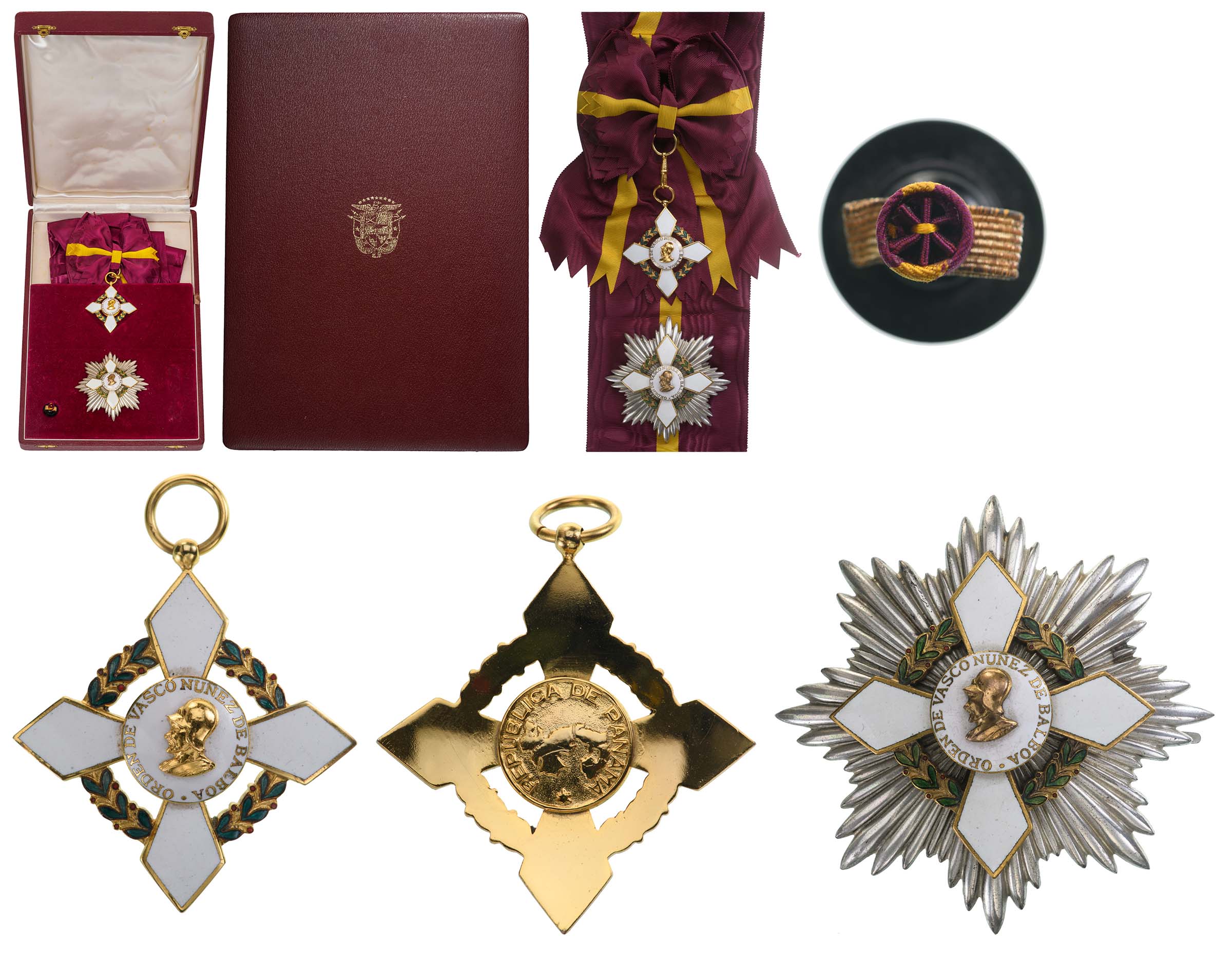 Grand Cross Set, instituted in 1941. Sash Badge, 63x58 mm, gilt Silver, one side enameled, center gilt enameled, with original suspension ring and long complete sash. Breast Star, 80 mm, partially gilt Silver, superimposed parts enameled, reverse with long horizontal pin, in case of issue, with gilt monogram on the lid and rosette. very attractive set, in superb condition. I