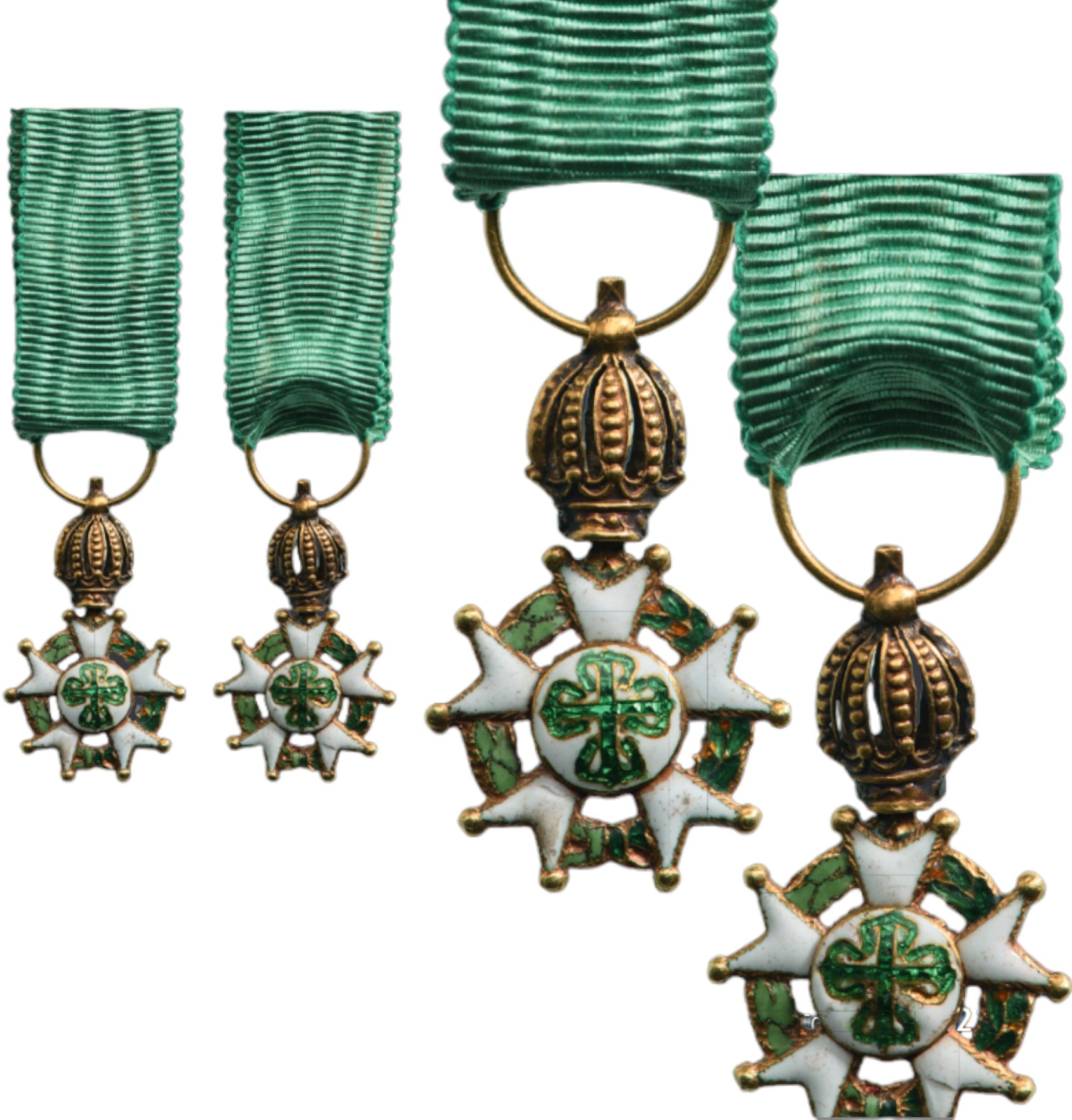 Knight’s Badge of the Order, 24x15 mm., GOLD, with white enameled, 5-armed cross with ball-finials, flanked by green enameled laurel and olive wreath, white enameled centre medallion on both sides, bearing the green enameled cross of the Order, on top, the typical, Brazilian Imperial crown, the orb, with round suspension ring, original, silk ribbon.