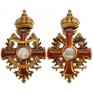 Miniature of the Order's badge in GOLD and enamels, 30x18 mm, separately made medallions and chain‚ bearing the order's motto 'VIRIBUS UNITIS', hinged crown with enameled details, suspension ring missing. An excellently made, early piece; the style and detail, allow us to attribute the piece to the workshop of Resch, Vienna, earlier than 1867. I