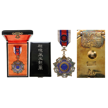 4th Class Officer’s Badge in gilt Silver and blue enamel; centre medallion set with a cut, blue stone; smooth reverse, struck with Chinese marks and the number “60”; ornamented, linked suspension and original ribbon with rosette; in the original, lacquer case of issue with Chinese inscription on the lid. A very rare decoration, almost excellent condition and nicely toned. Dim.: 84,0 x 63,0 mm. I RR!