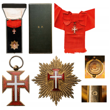 Grand Cross Set, 1st Class, instituted in 1789. Sash Badge, 41x28 mm,gilt Silver, maker`s mark, both sides enameled, original suspension ring and sash. Breast Star, 82 mm, gilt Silver with brilliant cut rays, maker`s mark "Lemaitre, Paris", central medallion gilt silver, enameled, reverse with vertical tapered pin and two side hooks, in original case of issue by "Lemaitre, Paris". An extremely attractive set, of best French jeweler`s quality! I R!