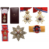 Grand Cross Set, Civil Division, 2nd Type, instituted in 1847. Sash Badge, 88x63 mm, GOLD, ca. 35 g., both sides enameled, both central medallions GOLD, enameled, with Royal Crown suspension device and complete sash. Breast Star, 77 mm, diamond cut Silver, maker's mark "I. Tostrup - Kristiania", gold Royal Monograms and enameled center medallion, reverse with long vertical pin, in case of issue by "I. Tostrup" with gilt inscription and crown on the lid and button hole rosette. Mint state and of high jeweler's quality! I R!