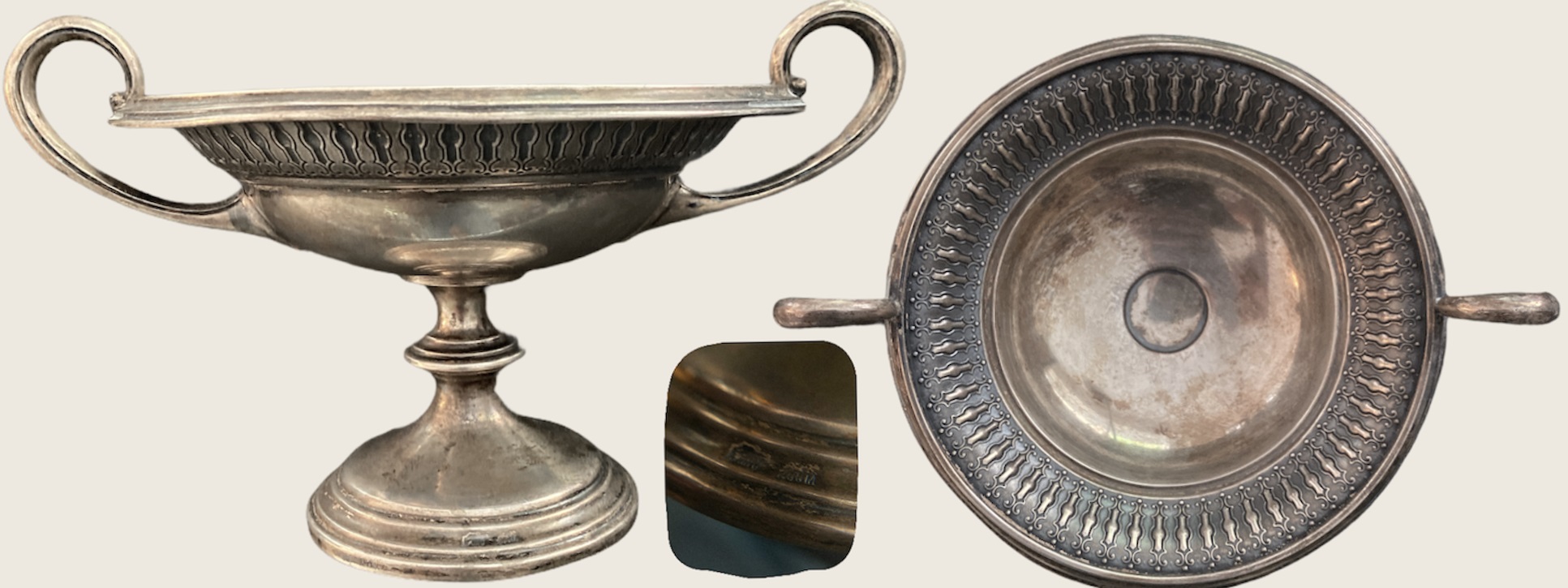 Beautiful silver cup on a curved piedouche, flared body with two lateral handles, very beautiful decoration on the outer edge and interior in azure enamel with Greek motif. Period late nineteenth, warranty hallmark 800, work signed "Rawill", undoubtedly a Swiss silversmith. Weight 172 g, height 9 cm, diameter 15 cm handels included. Good condition