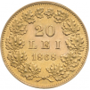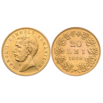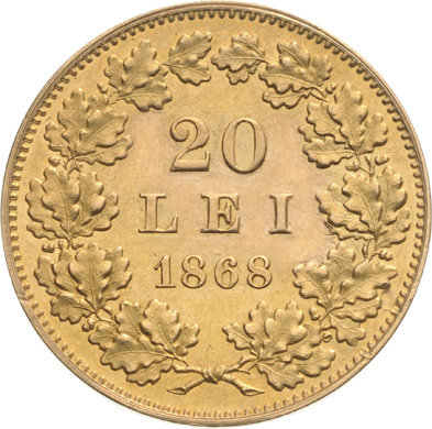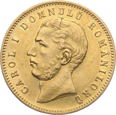 Gold, 6.40 g., Stamb. 10.1.1. The rarest Romanian coin, 100 pces minted (50 were buried in the foundation of the Royal Palace Peles in 1875), very few survived! The best example known of the circulating coin, highly rarer then the pattern, that you regulary see in auctions! UNC! RRRR!