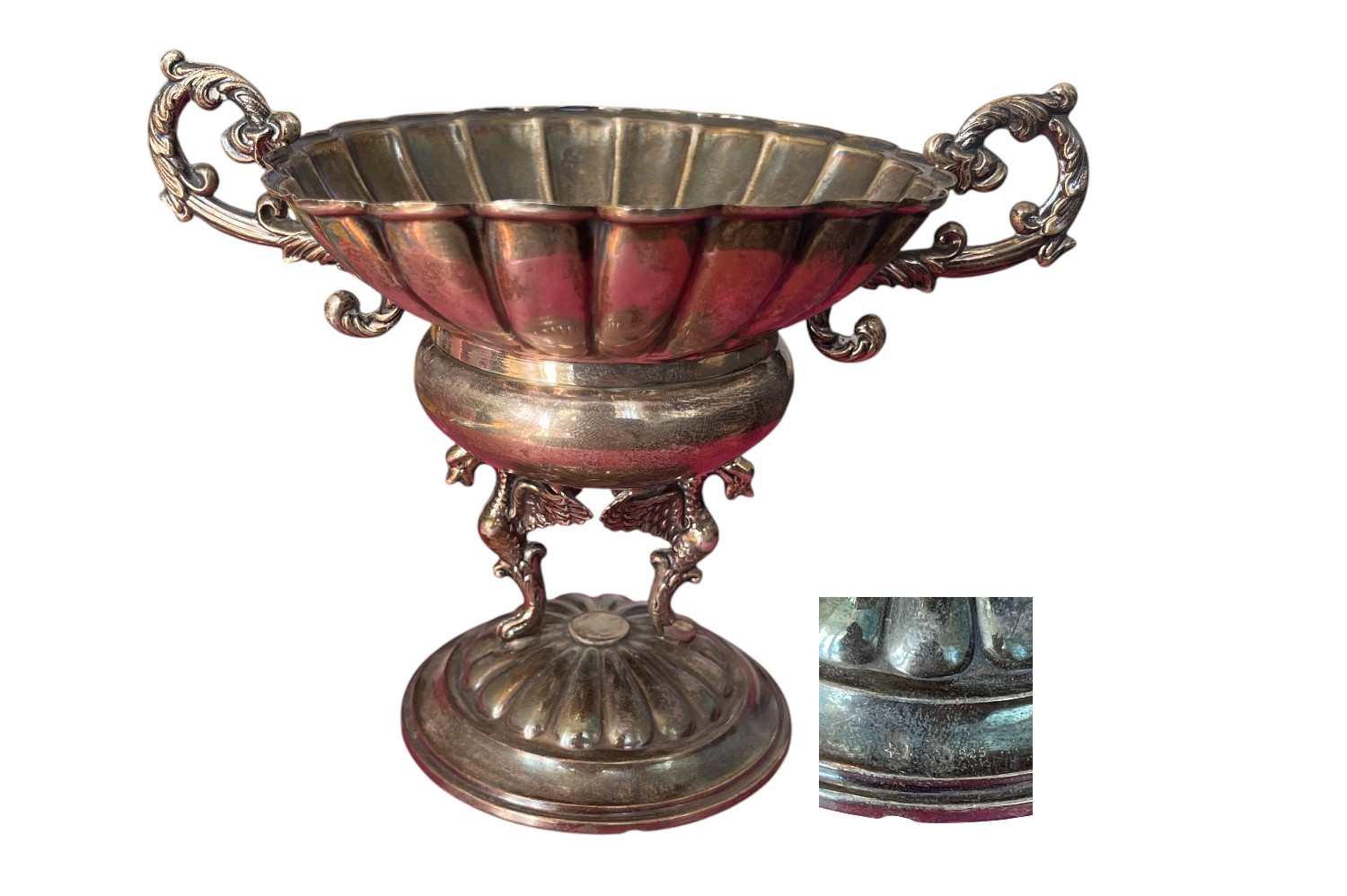 Elegant sterling Silver footed compote bowl of neoclassical design, featuring a shallow fluted bowl with gracefully scrolled handles raised on a pedestal base with ribbed decoration and ornate feet. Hallmarks "925"- Star. Dim: H: 13 cm, diamenter, 11.2 cm. Weight: 125 g. Perfect condition. Superb! I