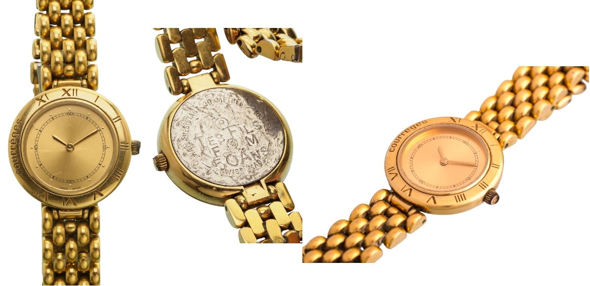 Courrèges bracelet ladies watch, 26 mm., gilt dial and bezel, with roman numerals for the hours and arabic numerals for the minutes quartz mechanical movement. In perfect condition.