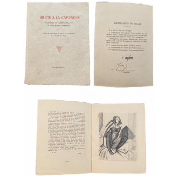 Very rare: DROZ (Gustave, attributed to) - A SUMMER IN THE COUNTRYSIDE, fragments of correspondence from two young Parisians, decorated with B&W chisel engravings and Ming's pen drawings - Private edition (16,5 x 12,5 cm), 48 pages, cardboard parchment gray, copy countersigned by the illustrator, 3rd large paper N 24 (small edition of 150) on luxury bouffant paper. In the continuity of the famous original 1868 edition of Poulet-Malassis, our edition, probably clandestine printed during the Second World War, echoes the shamelessness of society under the Second Empire. Good condition, small skin at the back.This absolutely untraceable edition is not in the inventory of any library. RR!