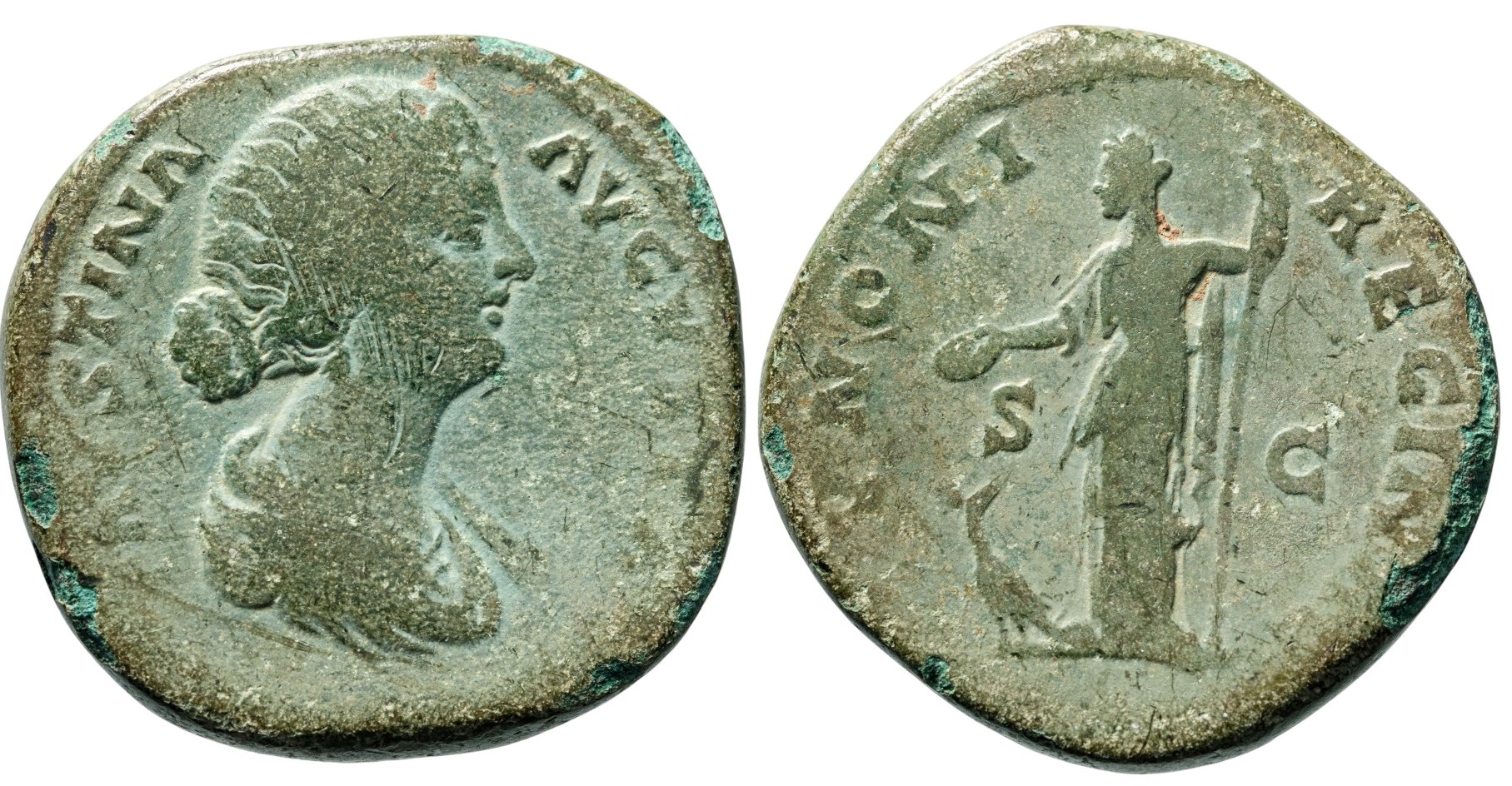 FAVSTINA AVGVSTA draped bust right/ IVNONI REGINAE Iuno standing left, holding patera and sceptre, peacock at her feet; S - C across fields. RIC III, 1651 (Marcus Aurelius). Cohen III, 148. Superb green sand patina! VF+