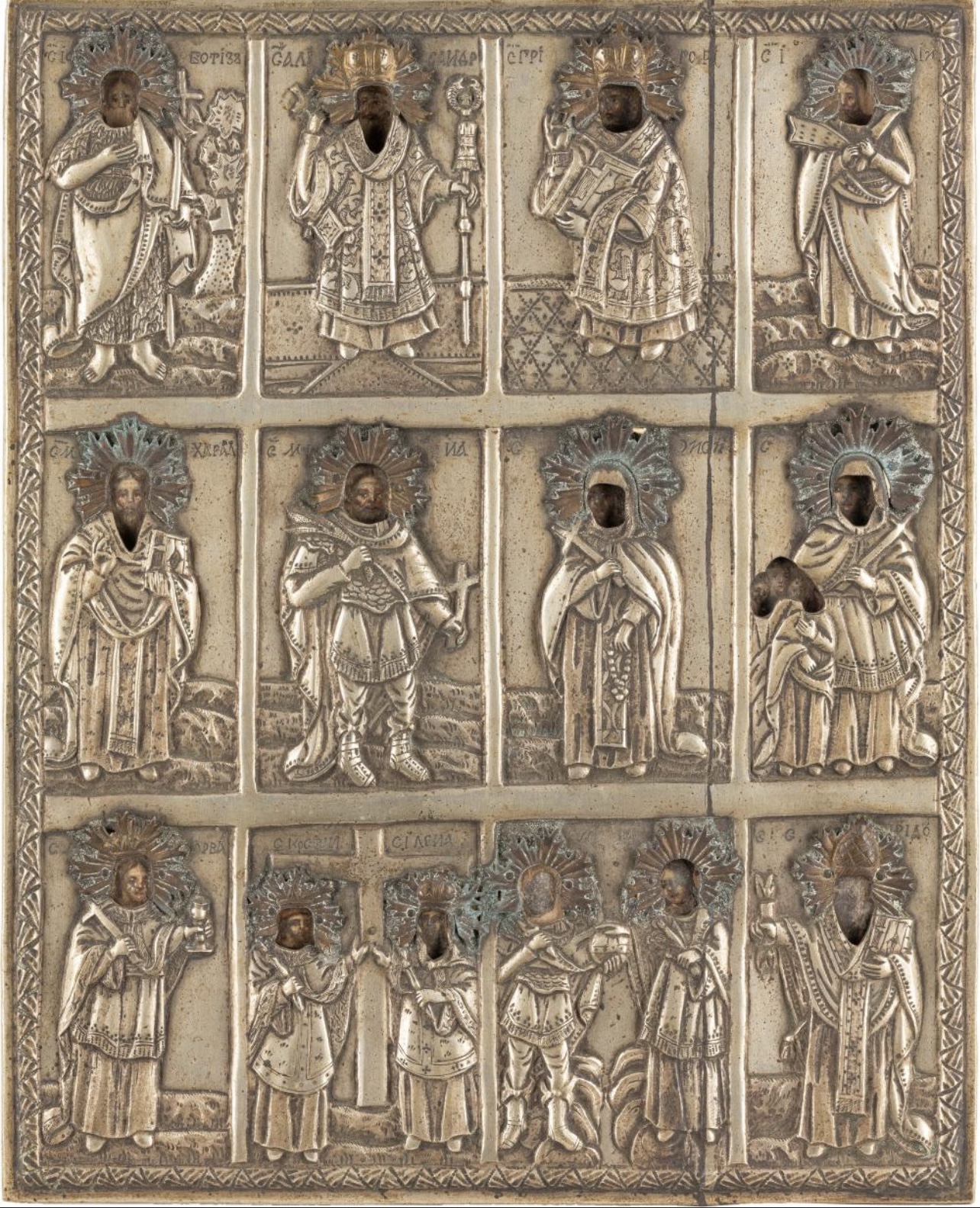 Greek style Icon of devotion, painting on wood under oklad in silver relief, representation in twelve boxes of saints, bishops and martyrs including Baptist, Gregory, Ilias (Elie), Cyrille, Maurice, Emperor Constantine and Helen, Geneviève of Paris ... Highlights of gilding and enamel paint for the halos and crowns. Ribbed hem border frame. Good general condition despite wear to the paint. Work from the mid-19th century. Dimension 32,5 * 27,8 cm. I-II