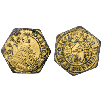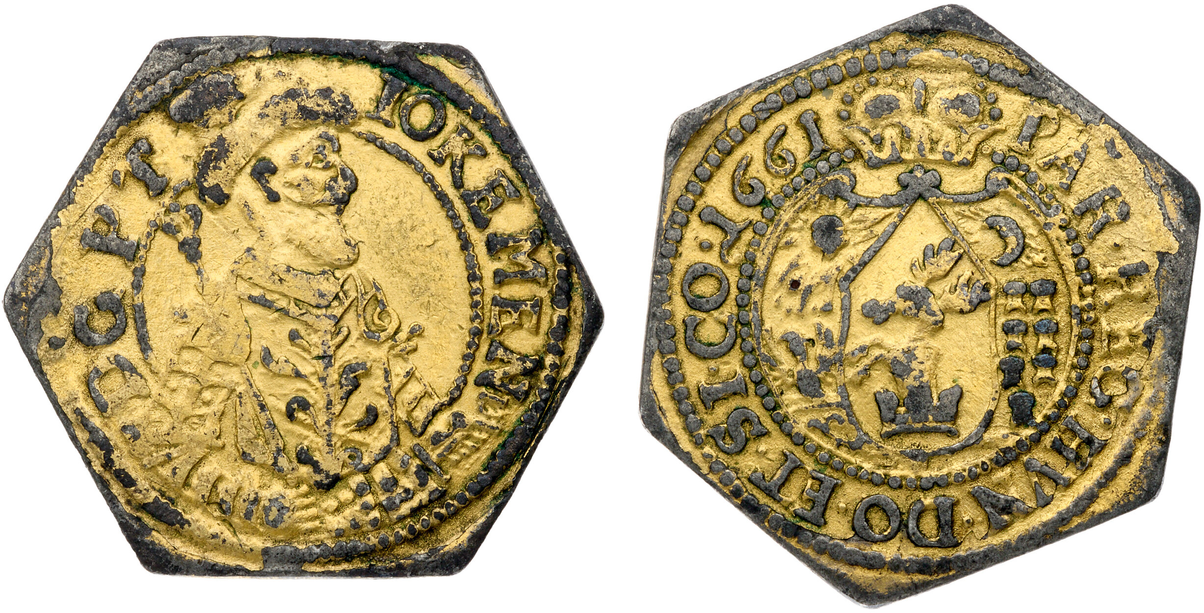 Gilt Silver, 5.39 g. Armored half-figure right, wearing fur hat and holding scepter against shoulder, IO KEMENi D G P T. / Stag Arms of the Kemeny family in crowned cartouche, Transylvanian Arms around, all within a beaded central circle, PAR.REG.HVN.DO.ET. SI.CO.1661 (Cf.Resch 4). An interesting fourrée of an extremely rare klippe, in extremely fine condition! RR!