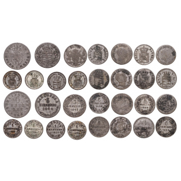 Baden, 6 Kreuzer 1807. Bavaria, 6 Kreuzer 1825, 6 Kreuzer (date not visible), 6 Kreuzer 1849, 1 Kreuzer 1864, 1 Kreuzer 1869, 1 Kreuzer 1870. Bamberg, 6 Kreuzer 1826. Baden, 3 Kreuzer 1843. Sachsen-Meiningen, 6 Kreuzer 1834. Wurttenberg, 6 Kreuzer 1829, 6 Kreuzer 1844, 6 Kreuzer 1849, 1 Kreuzer 1869. VF- / VF+ (15)