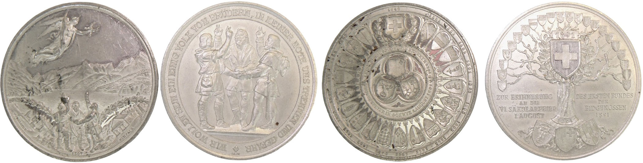 Medal for 600th Anniversary of the Swiss Confederation. Dated 1 August 1891, White Metal (51 mm, 41.41 g); Medal 1891 Commemorating the VI. Secular celebration of the First Confederation of Confederates, Aluminium (50 mm, 15.75 g). XF-UNC! (2)