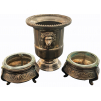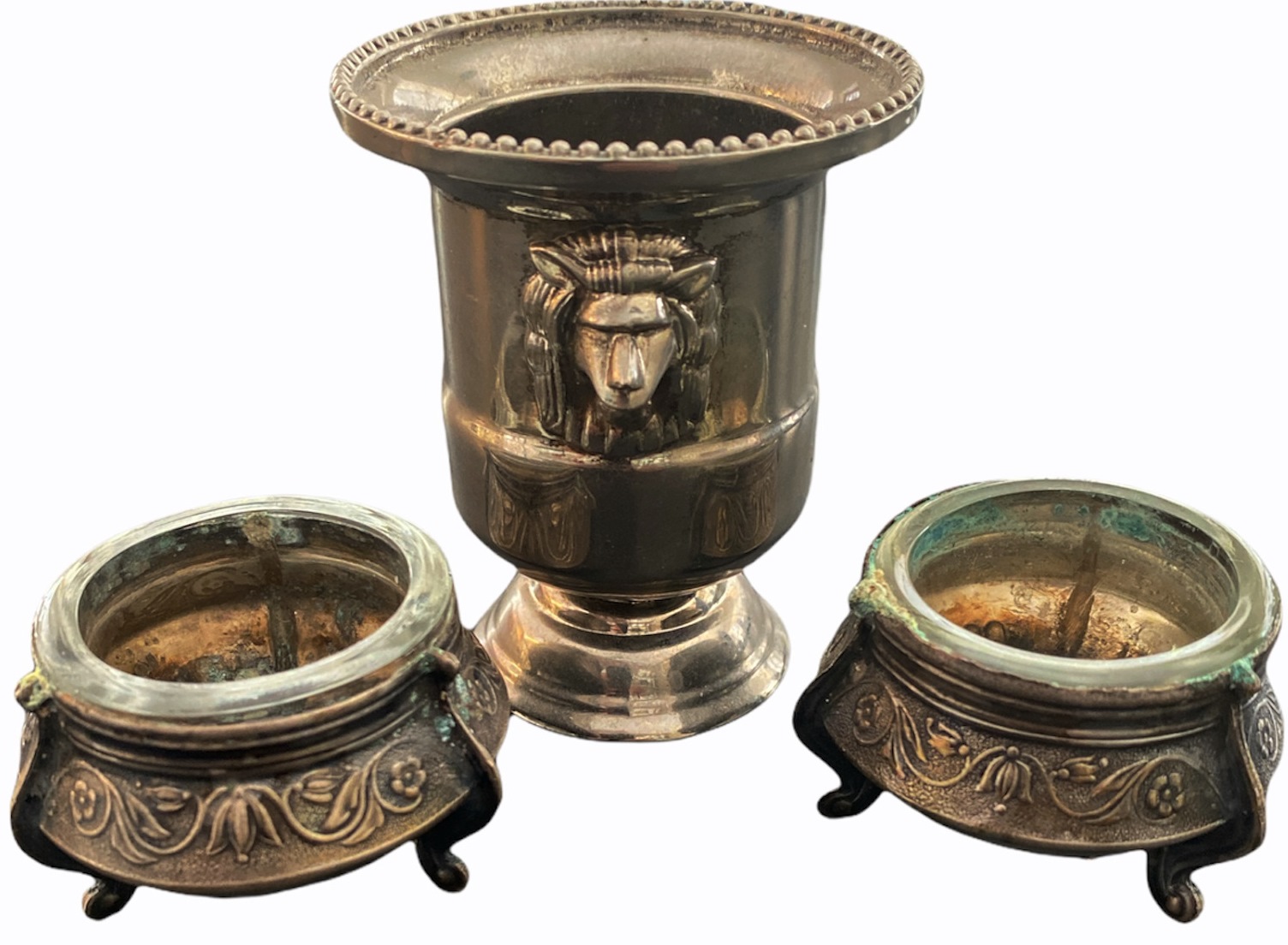 Lot composed of three table elements in silvered metal: 1. pair of round tripod salt shakers in the shape of a basin, neo-antique model decorated with a plant frieze around the border, glass interiors. Partial engraved hallmarks, manufacture from Turkey or North Africa (Hammamet...), dimensions 52 x 34 mm, good condition, 2. decorative cup in timpani form, neo-antique model on piedouche with wide flared pearl border, body adorned with a head of a mythological animal (wolf? ...). Probable manufacture from Turkey or North Africa, dimensions 80 x 64 mm, good condition.