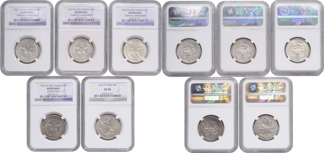 SKU: 500 The Live Auction begins in: Click here to register for the live Auction Starting price 150 EUR Log in to place a bid. Total bids: 0RUSSIA1922 NA (1), 1924 NA (3), 1924 AT (1). KM Y83, Y89.1 NGC AU 58(1). UNC details (4). (5) Shop ID: 3722/42Auction LXIX