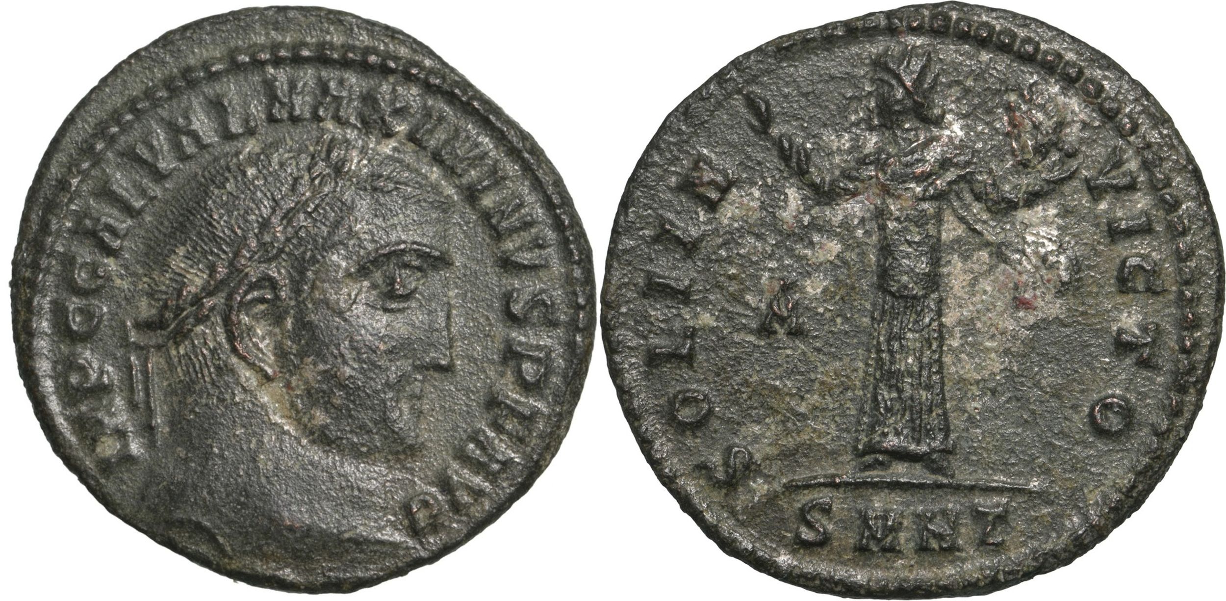 IMP C GAL VAL MAXIMINVS P F AVG Laureate head right/ SOLI IN - VICTO Sol standing left in long robe, raising right hand and holding head of Serapis in left hand, SMHT in exergue, M in left field. RIC-78. VF+
