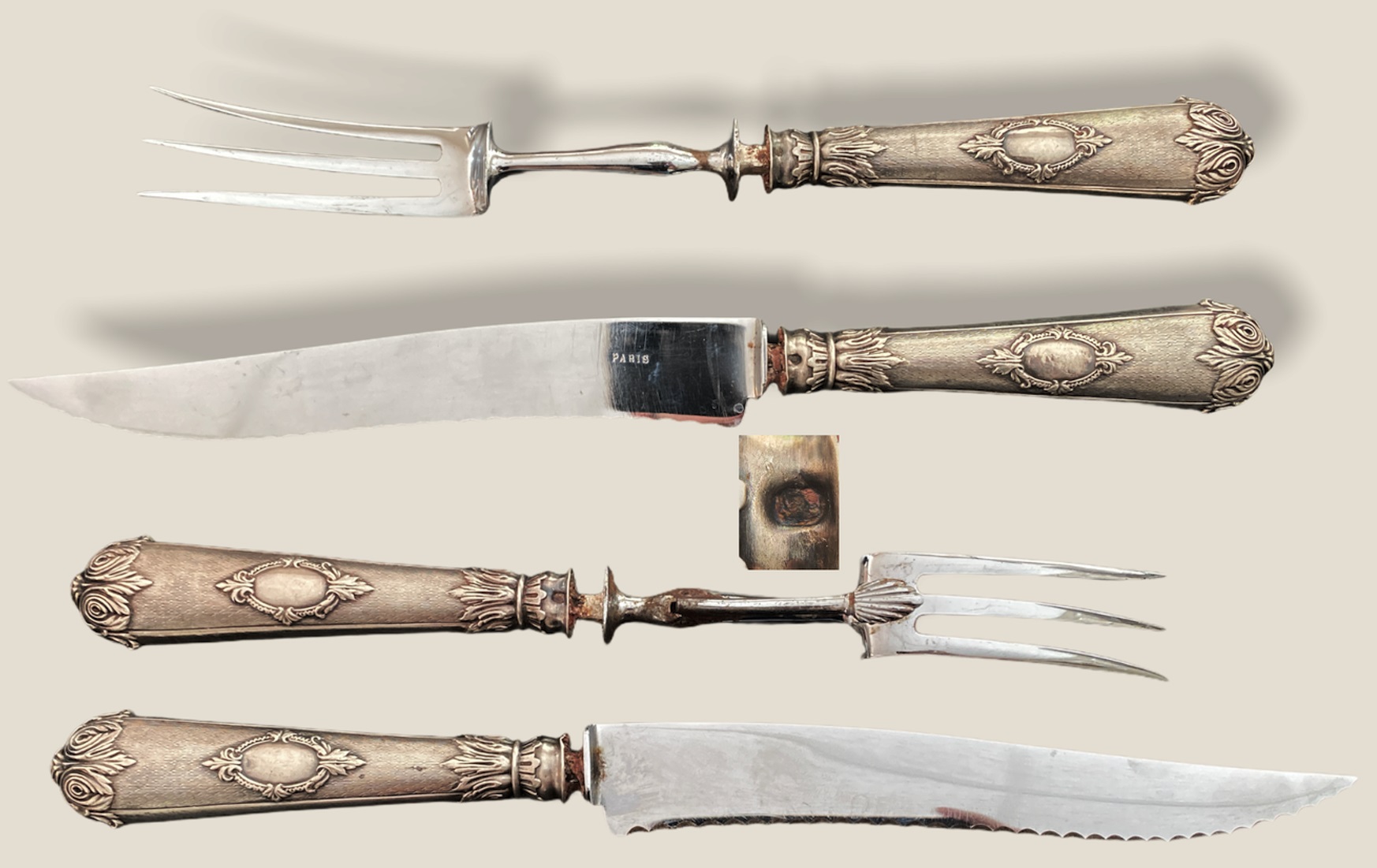 Serving cutlery in filled silver and steel, serrated knife and fork with movable edge, handles with homogeneous decoration finely engraved with a guilloche background, feather appliques, mude cartridges. Minerve guarantee mark (925/1000), France around 1900, length 32 & 28 cm., 260.1 g (total weight). Good condition.
