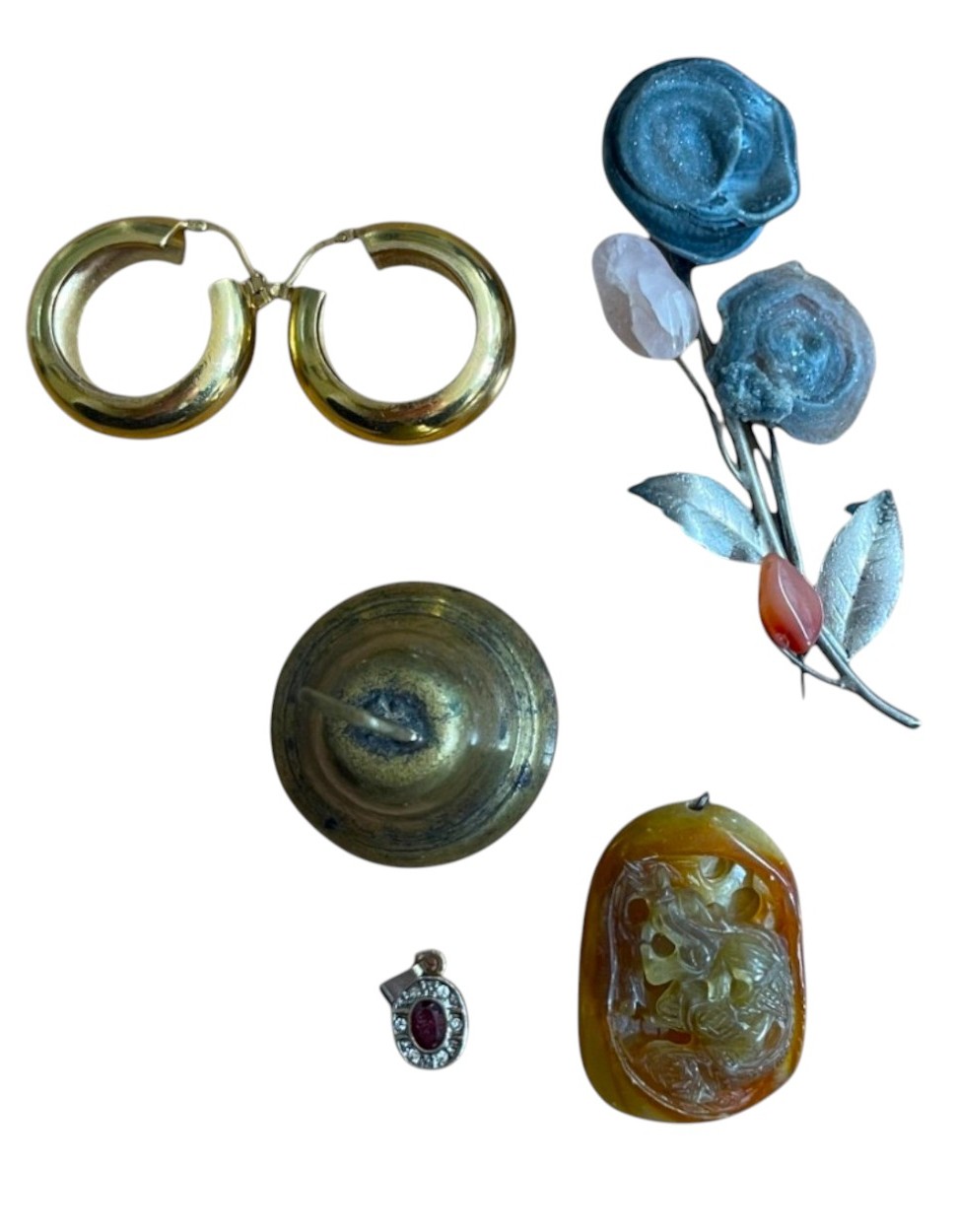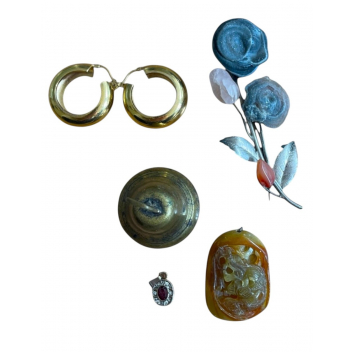 SKU: 812 The Live Auction begins in: Click here to register for the live Auction Starting price 30 EUR Log in to place a bid. Total bids: 0JEWELLERY1 x rose style brooch with amber, 1 x pair of gilded earrings, 2 x pendants, 1 x brass box filled with alphabet bracelet files. Superb lot! (5) Shop ID: SE 4Auction LXIX