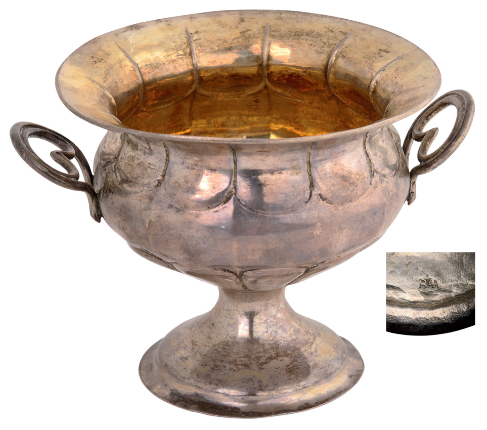 SKU: 881 The Live Auction begins in: Click here to register for the live Auction Starting price 250 EUR Log in to place a bid. Total bids: 0SILVERWARE - RUSSIALateral handles and lobed sections, carving with eggshaped motives on the paunch, weight 182 g, 10 cm high, "84" standard garantee (marked three times, not of other mark). Shop ID: 3713Auction LXIX