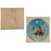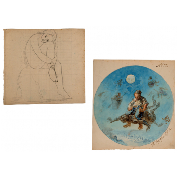 Circular view representing "Farmer riding on the devil in the sky", subject of a popular tale, monogram "E" of Nikolai Ludwigowitch Ellert on January 12th, 1873. The famous composer Tchaikovsky created in Moscow (supervisor Nicolas Rubinstein) symphony no. 2 "Little Russia" on January 26th, 1873, based on Ukrainian folk tales. Ellert was stage draftsman in charge of decorations of Imperial Opera in Moscow and likely produced this preparatory watercolor for this occasion. Sheet in good condition, dimensions 44.5x41.5 cm.