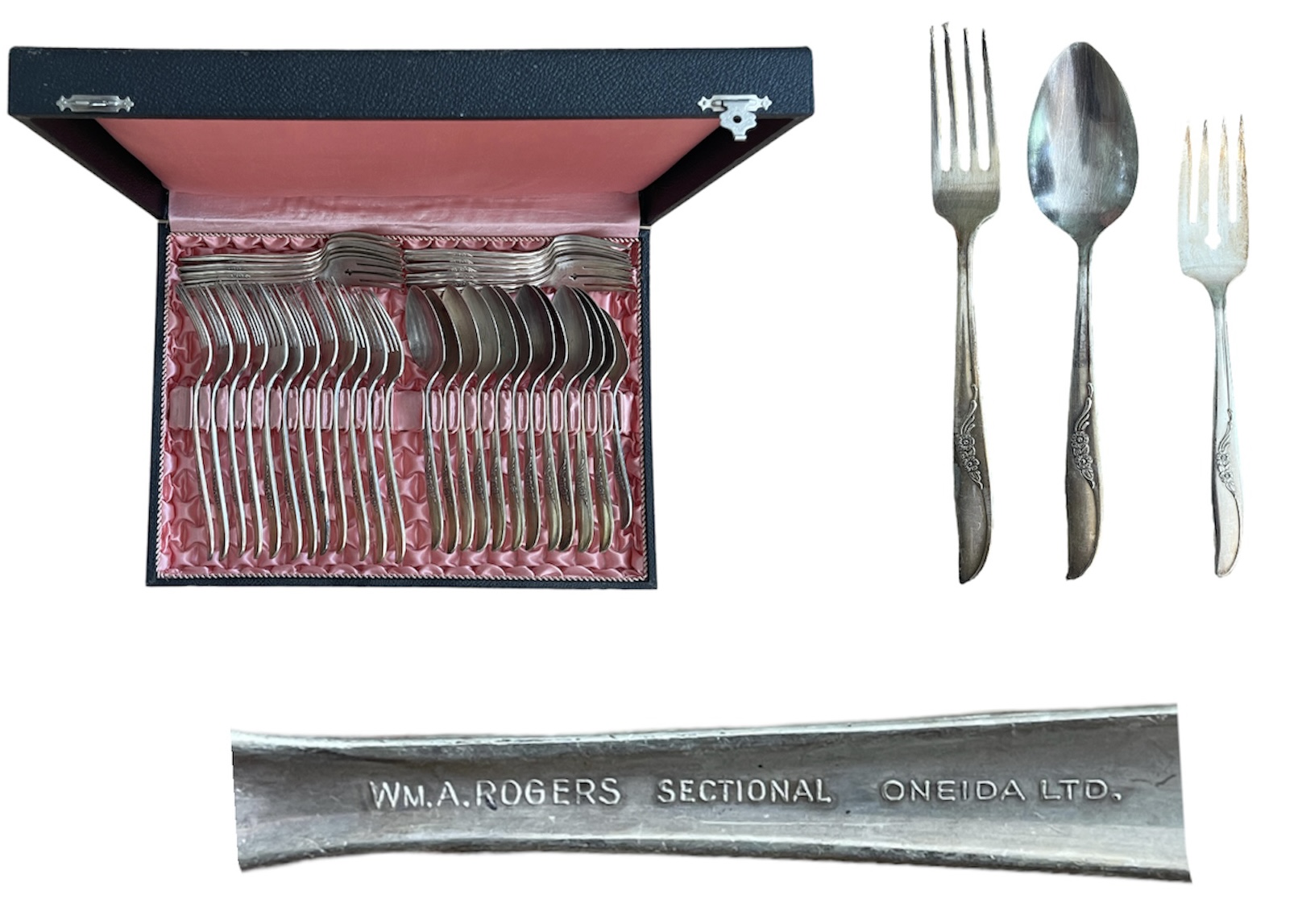 Silver plated William Rogers silverware set composed of 12 forks, 12 spoons and 12 desert forks in a fitted case from E. Chatelain, Lausanne. Good condition with occasional ware. I-II
