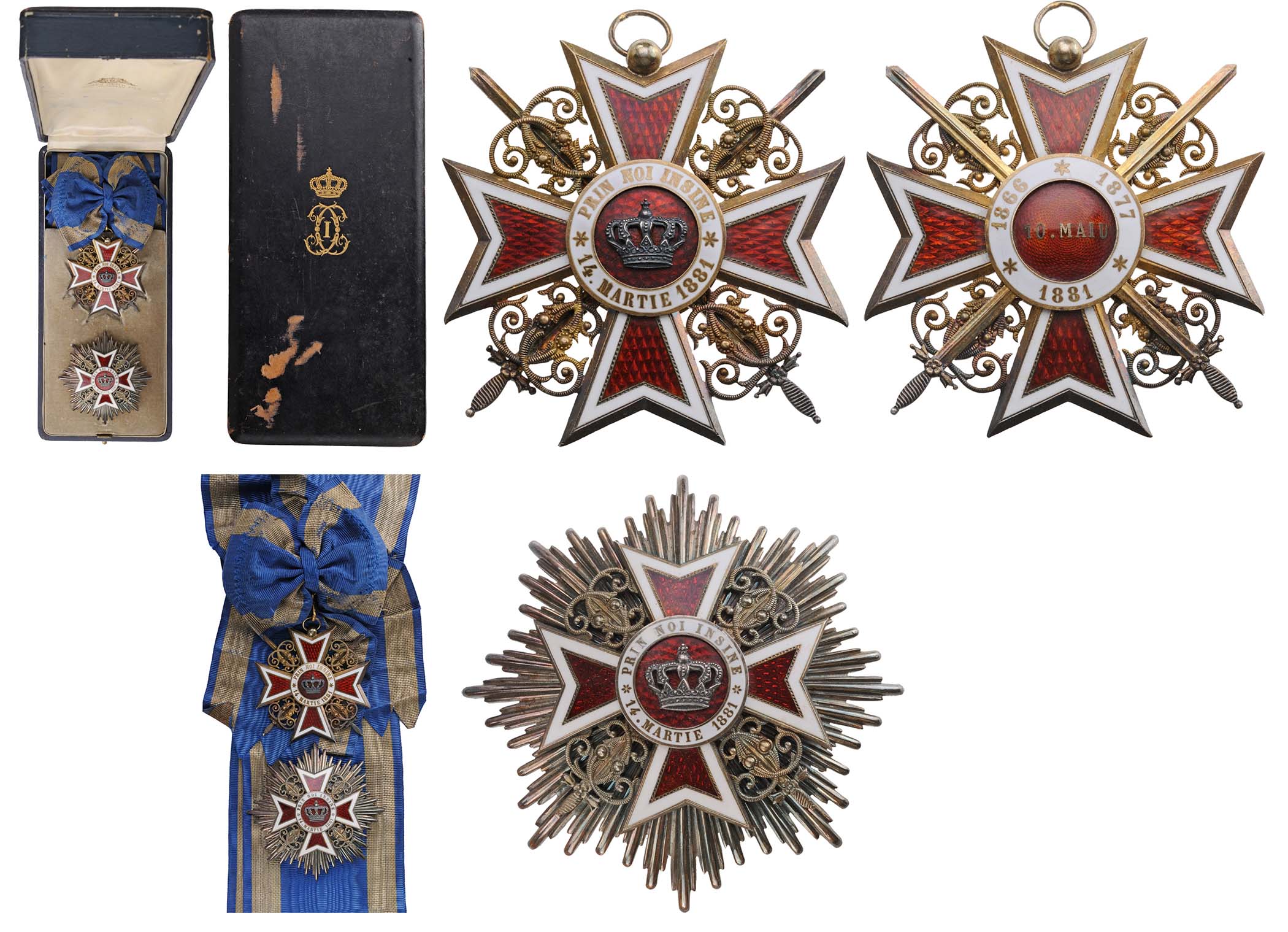 Grand Cross Set, 1st Type, MIlitary. Sash Badge, 80 mm, gilt Silver, enameled, original suspension ring and long sash. Breast Star, 85 mm, Silver, enameled with pin and two side hooks on reverse, in original case of issue by "Joseph Resch, Bucarest", with monogram of King Carol I on the lid. A very rare set of French fabrication, of the highest jeweler's quality and in extremely fine condition! RR! I