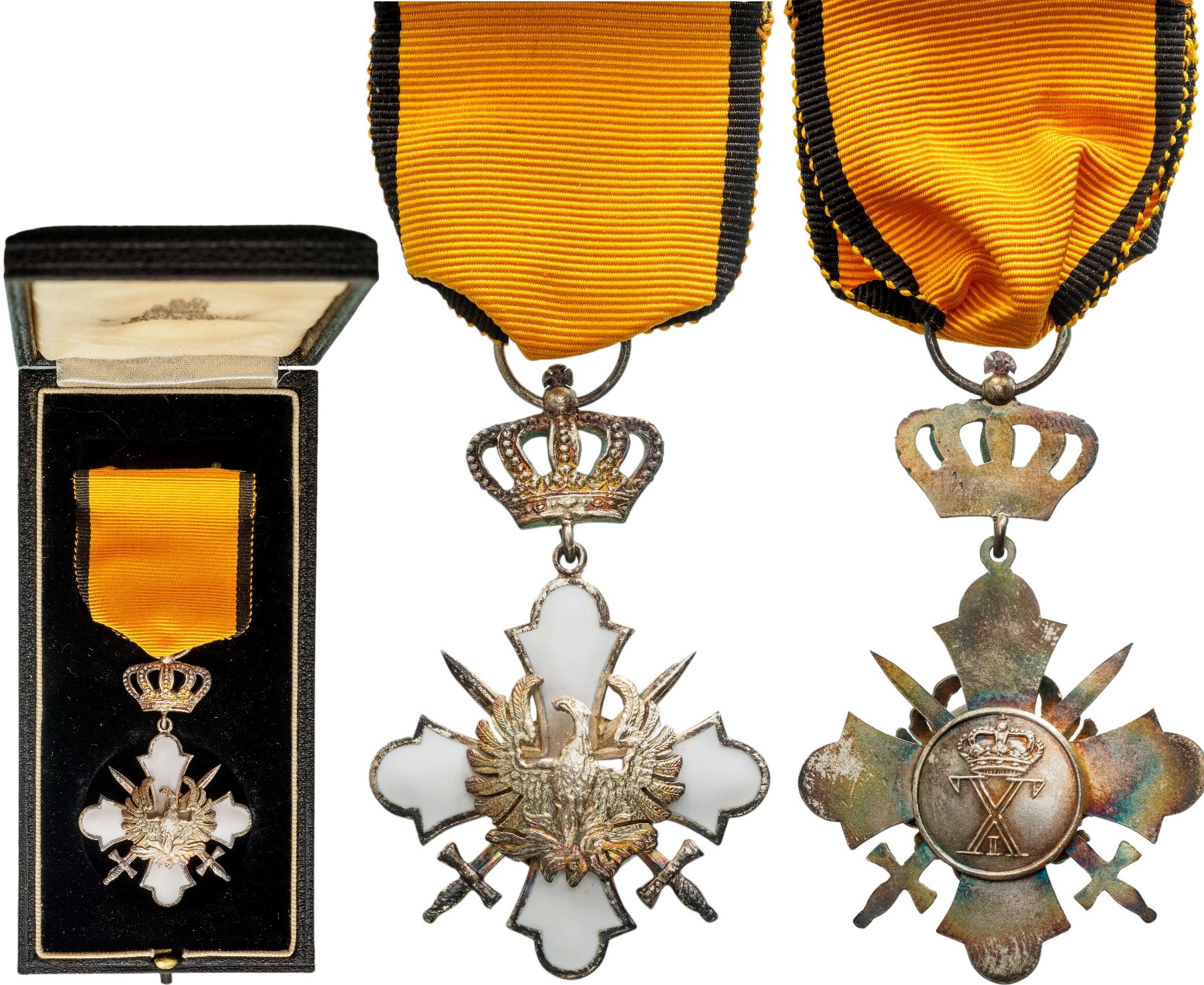 Knight's Cross with Swords, 2nd Type. Breast Badge 58x38 mm, Silver and white enamel, obverse centre with convex phoenix rising from the flames, crossed swords between the cross's arms, reverse medallion with royal monogram "X", crown suspension, circular ring and tapering ribbon ring, original ribbon, in case of issue by "Spink&Son Ltd., London". A rare decoration, with nice patina and in extremely fine condition.. I R!