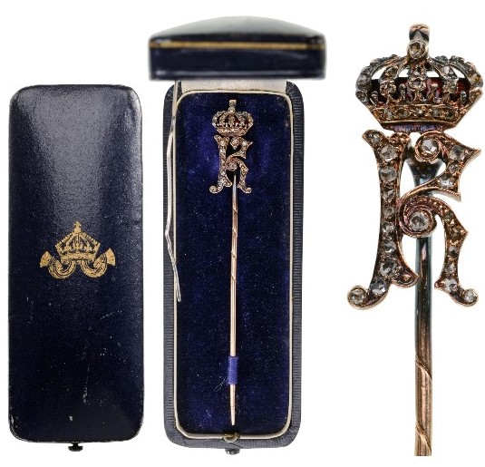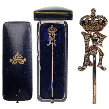 Breast Badge, 19,5 x 12 mm., GOLD, crowned cyrillic “K”, profusely set with Diamonds, long, vertical golden pin, in the original, deep-sea-blue case of issue.