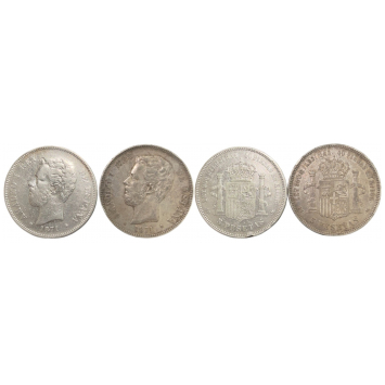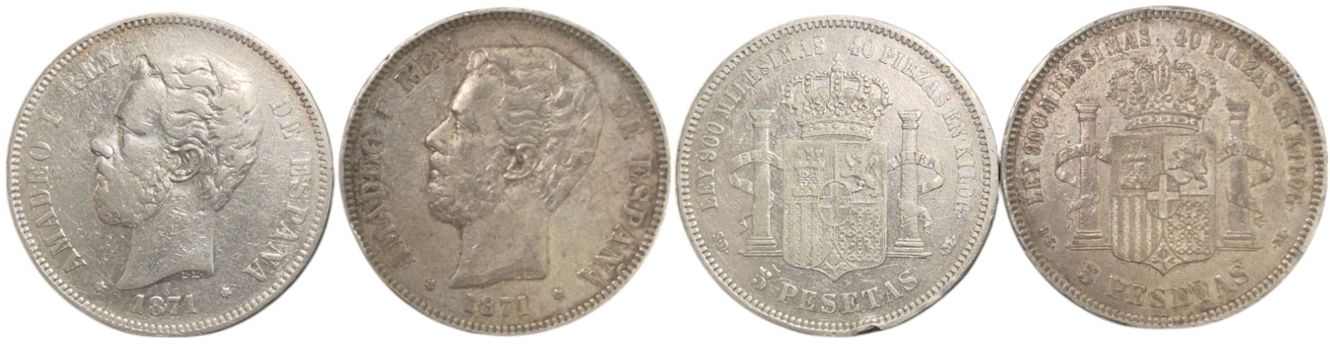 Amadeo I (1871-1873) 5 Pesetas 1871 DEM, Madrid mint. Lot of 2.