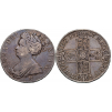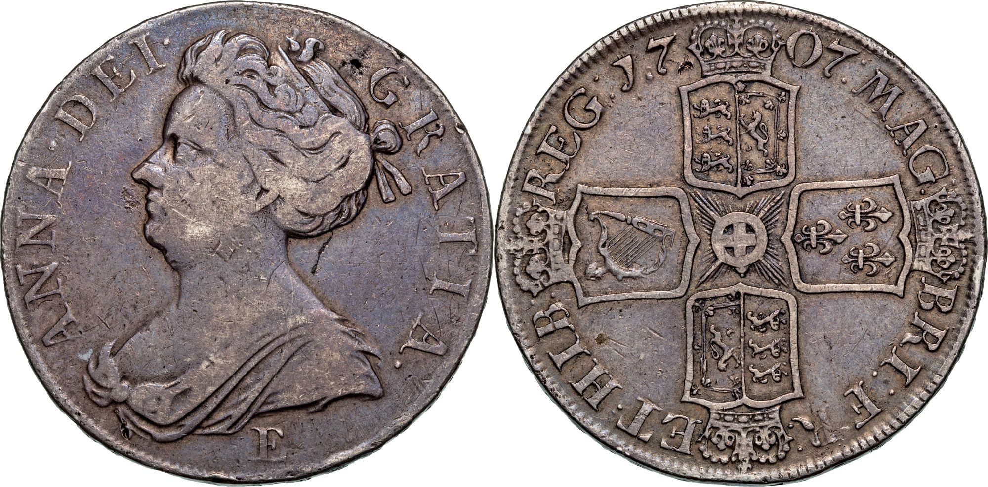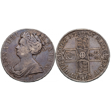 Silver, 29.86 g., Second draped bust left, toothed border surrounding both sides, legend reads ANNA DEI GRATIA / crowned cruciform shields, plain angles, nine strings to Irish harp, garter star at centre with sunburst, date flanking top crown, legend surrounding MAG BRI FR ET HIB REG, edge inscription *DECVS ET TVTAMEN ANNO REGNI SEPTIMO. S. 3601; Bull 1344; ESC 104. Superb old cabinet patina! VF+