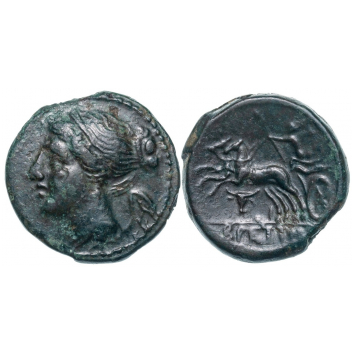Winged and diademed bust of Nike left, below neck, thunderbolt/ BPETTIΩN, Zeus driving biga left, holding thunderbolt and scepter, below horses, racing-torch. HN Italy 1989. HGC 1, 1372. Splendid cristal green patina, XF