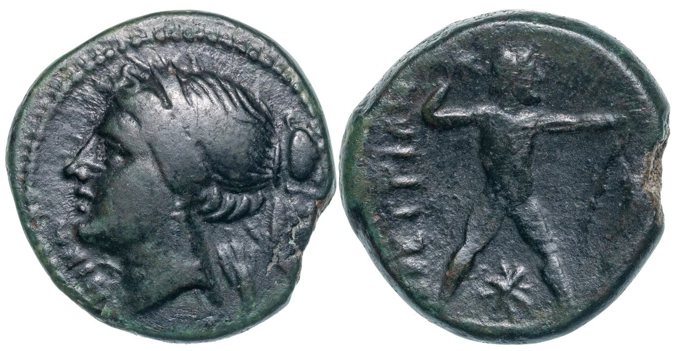 Diademed head of Nike left; behind, grain ear/ BPETTIΩN, Zeus standing right, holding sceptre and hurling thunderbolt; in field right, cornucopia; below, star. HN Italy 1983; Scheu, Bronze 27; HGC 1, 1371. Superb patina, good VF