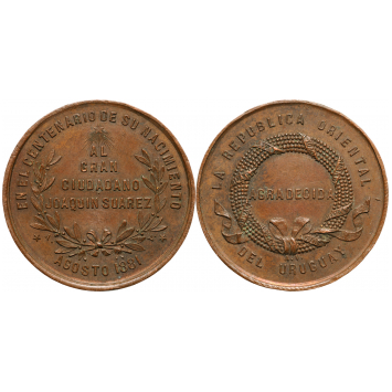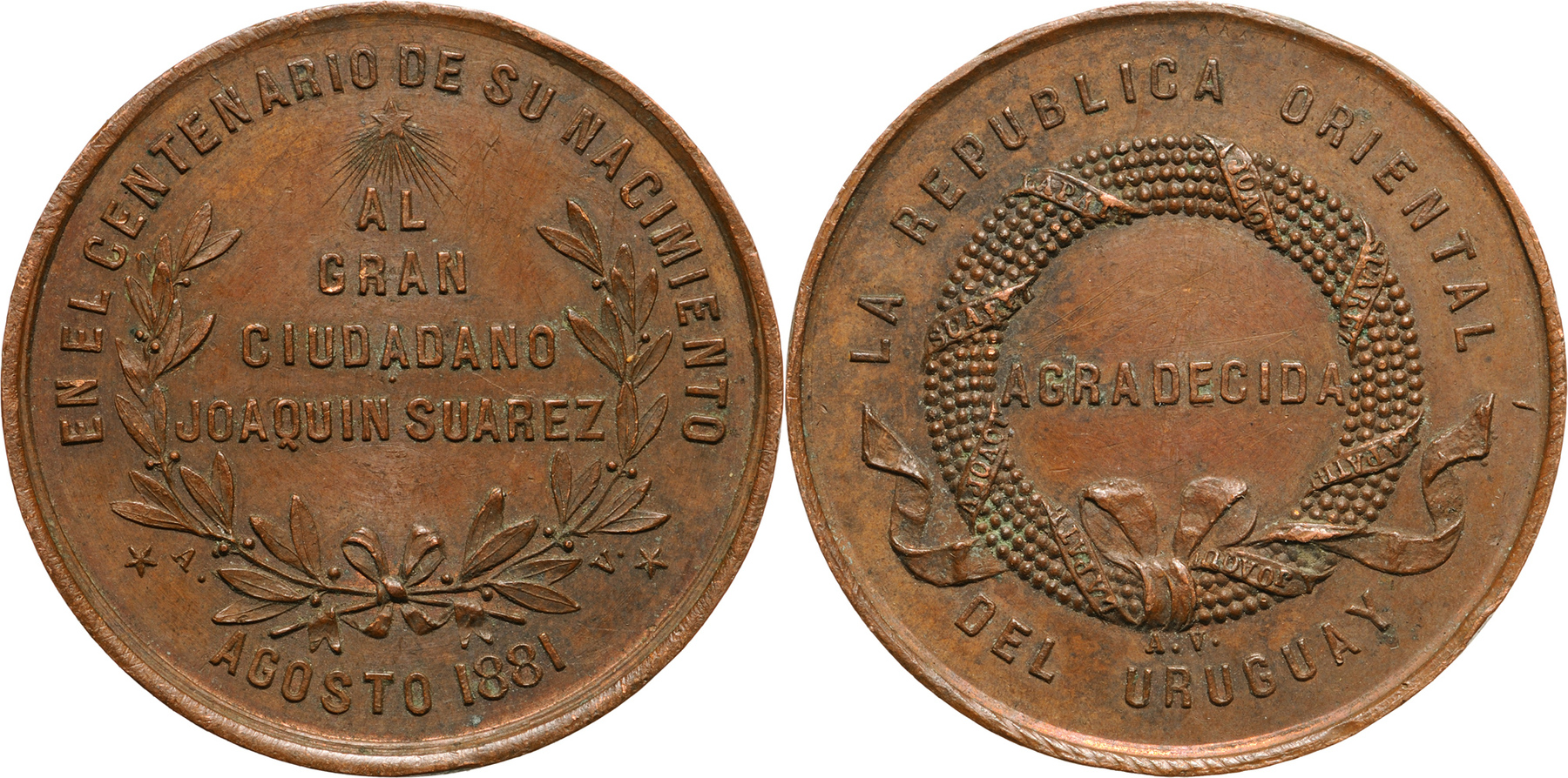 Centenary of the Birth of Joaquin Suarez Medal in Bronze, dated August 1881, signed A.F. Diam.: 33,5 mm, weight 16,10 g. II