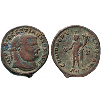 IMP C DIOCLETIANVS P F AVG, Laureate head right/GENIO POPVLI ROMANI / ANT, Genius standing left, holding patera and cornucopia; Z to right. RIC 52a. VF+