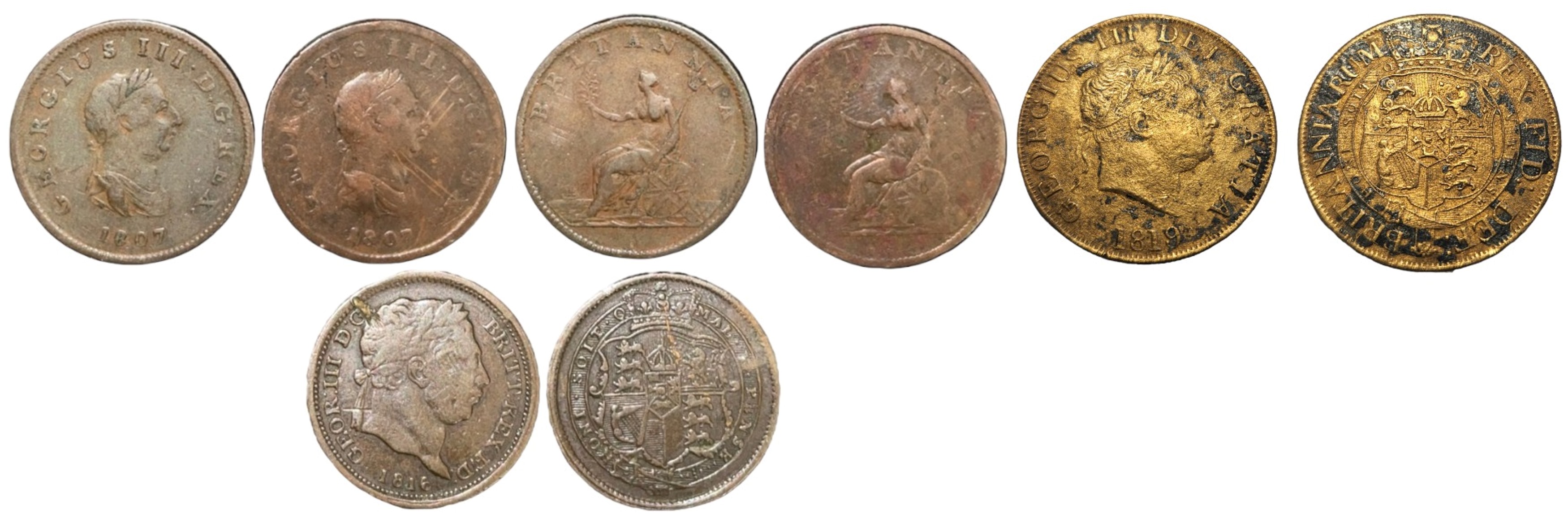SKU: 268 Auction has finished. Total bids: 0GREAT BRITAINHalfpenny 1807 (2), Sixpence 1816, Bronze, Halfcrown 1819, period counterfeit. KM 662. VF/VF+ (4) Shop ID: CP 222Low estimate: 150.00 EURhigh estimate: 300.00EURAuction LXVII