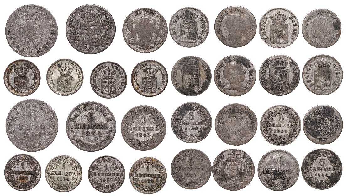 Baden, 6 Kreuzer 1807. Bavaria, 6 Kreuzer 1825, 6 Kreuzer (date not visible), 6 Kreuzer 1849, 1 Kreuzer 1864, 1 Kreuzer 1869, 1 Kreuzer 1870. Bamberg, 6 Kreuzer 1826. Baden, 3 Kreuzer 1843. Sachsen-Meiningen, 6 Kreuzer 1834. Wurttenberg, 6 Kreuzer 1829, 6 Kreuzer 1844, 6 Kreuzer 1849, 1 Kreuzer 1869. VF- / VF+ (15)