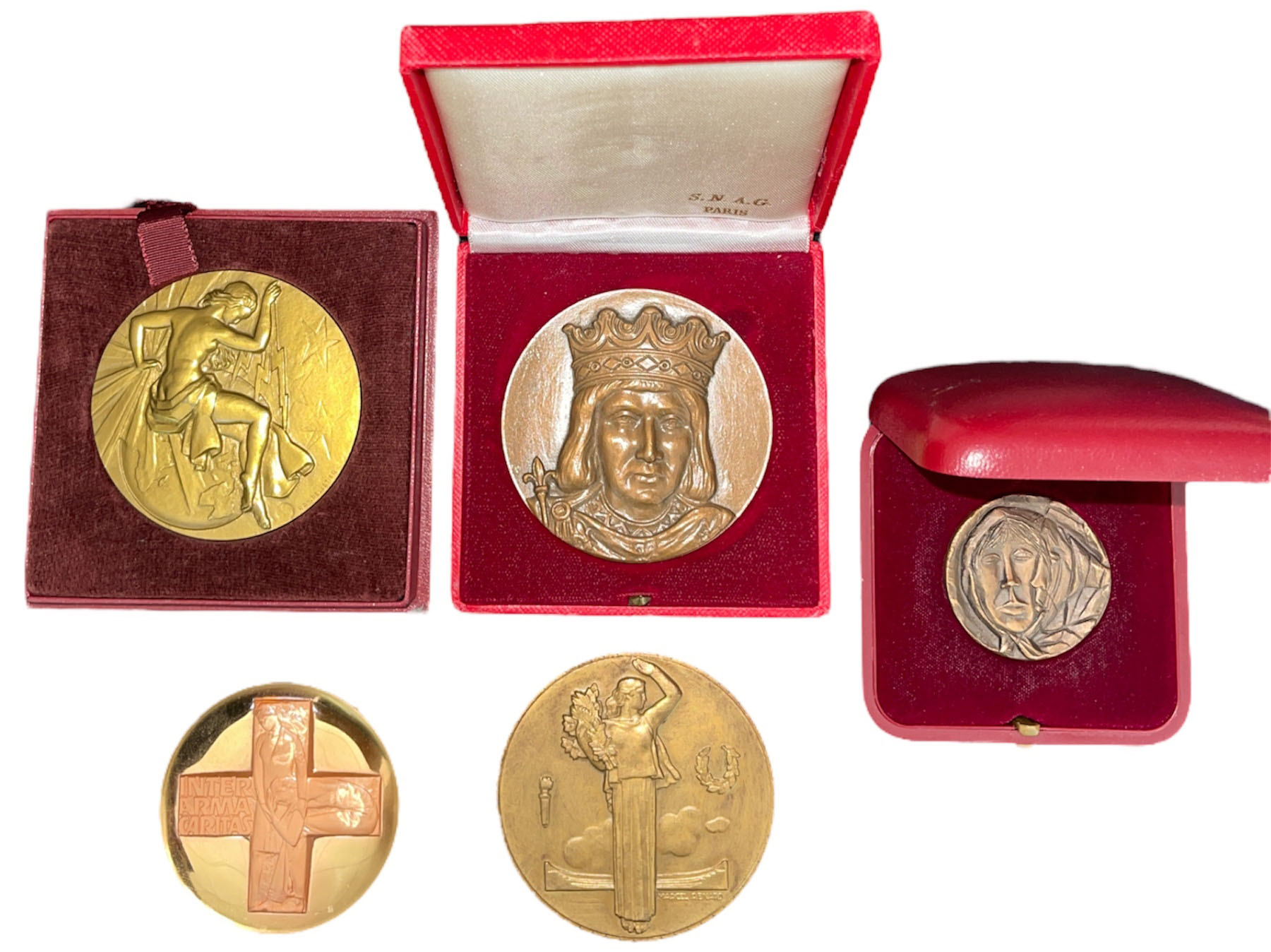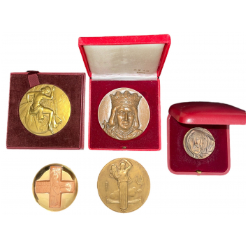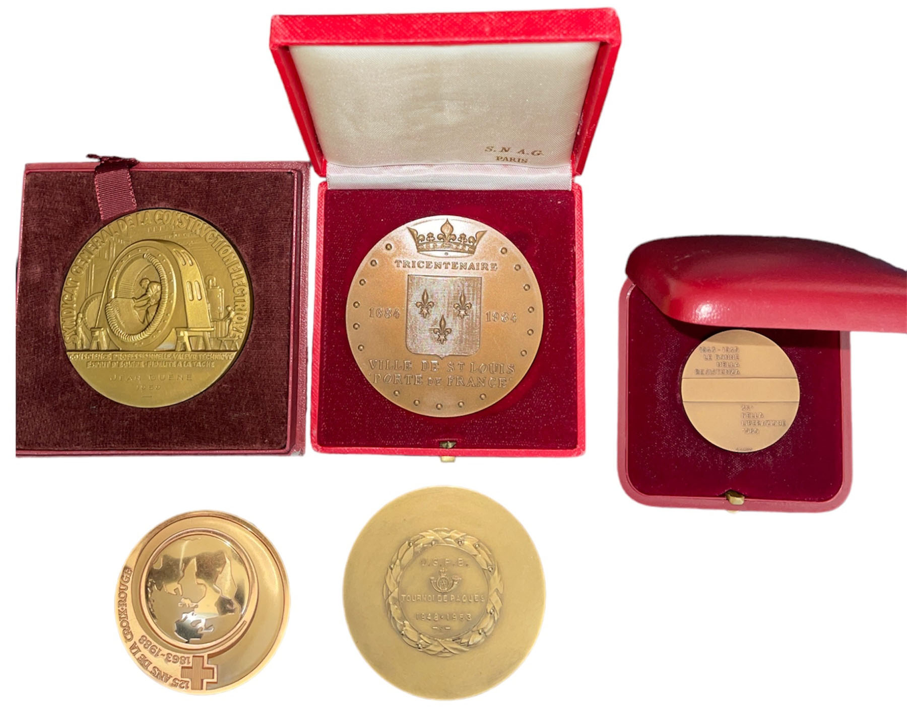 France. USPB Medal 1953, Copper (70 mm, 140.73 g) by Marcel Renard; Prize Medal of the Elecrical Construction Union 1959, engraved "Jean Eugene" in original case of issue; Medal for the 300 years of establishment of the city of St. Louis 1984, Bronze (68 mm, 199.61 g) in original case of issue; ITALY. Medal Commemorating the Women from the Resistance of WWII, 1980, Bronze (40 mm, 32.48 g) in original case of issue; SWITZERLAND. Medal for 125 Years of the Foundation of the Red Cross 1988, Bronze (60 mm, 93.30 g) in original case of issue. Very interesting group! XF+ - UNC (5)
