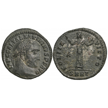 IMP C GAL VAL MAXIMINVS P F AVG Laureate head right/ SOLI IN - VICTO Sol standing left in long robe, raising right hand and holding head of Serapis in left hand, SMHT in exergue, M in left field. RIC-78. VF+