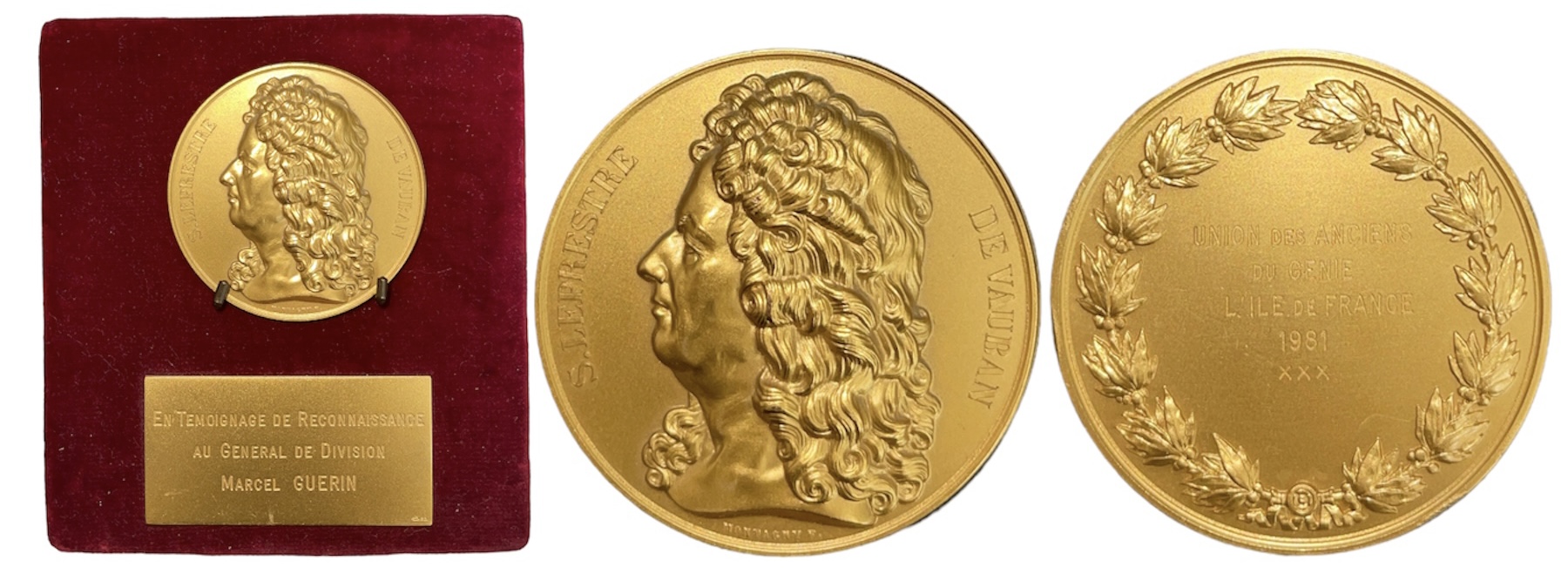 Medal from the Union of the Engineers Division for their General "Marcel Guerin", gilt Bronze (52 mm, 81.51 g)/ frame 100 x110 mm with support leg on the back. UNC!
